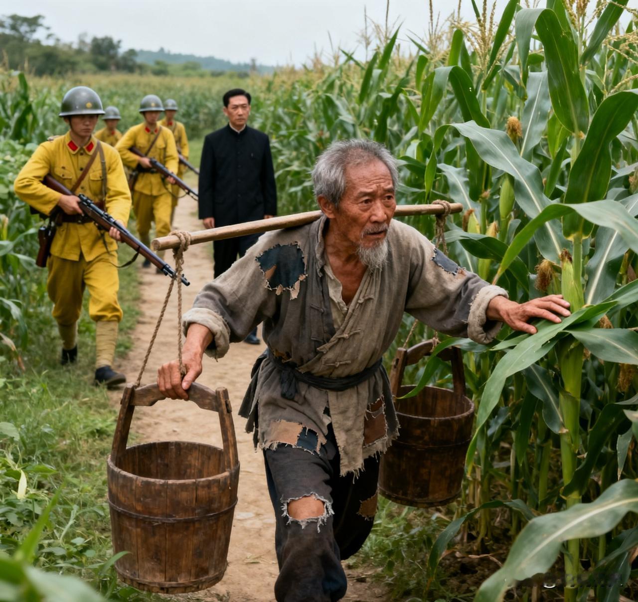 1942年,一老汉去给八路军送水时,半路上碰到了鬼子。他急忙挑着两桶水拐进了庄稼
