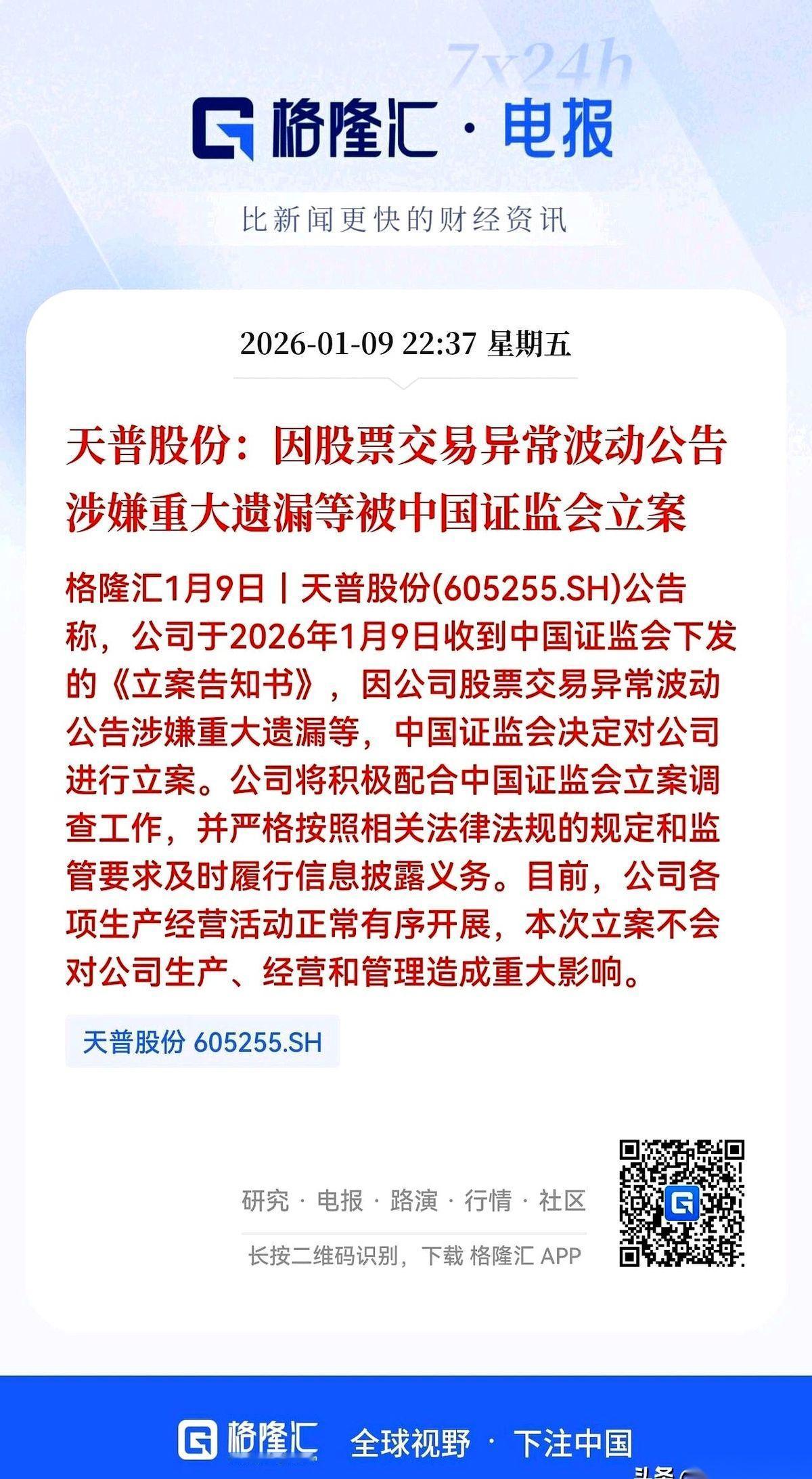 枪响了。 一年16倍,神话吧?今天一纸公文,直接按在地上。 天普股份,这个抱团炒上天的所谓“龙头”,被证监会立案调查了。 前段时间看着那K线图,跟通天塔似的,我都恍惚了,觉得是不是自己跟不上时代了。 满世界都在喊“搞高标、上龙头”,一群人眼睛血红,嗷嗷叫着往里冲,生怕自己错过一个亿。 谁还看基本面啊? 可笑的是,连公司自己都连发公告,喊着“我没那么值钱,大家冷静点”,结果呢?没人听。挡不住那帮杀疯了的资金。 现在,懂了吧? 这不是在查一家公司,这是在敲山震虎。是“有关部门”在给所有那些无脑狂欢的资金,清清楚楚地画一条线。 告诉你,游戏规则要改了。 鼓声停了。 音乐结束的时候,看谁还站在舞池中央,手里拿着那个传了N棒的滚烫山芋。 别总想着一步登天,哪有那么多坐火箭的买卖。 挣自己认知范围内的钱,晚上才睡得着。 下周一,有好戏看了。 我反正,先泡杯茶,坐着看。