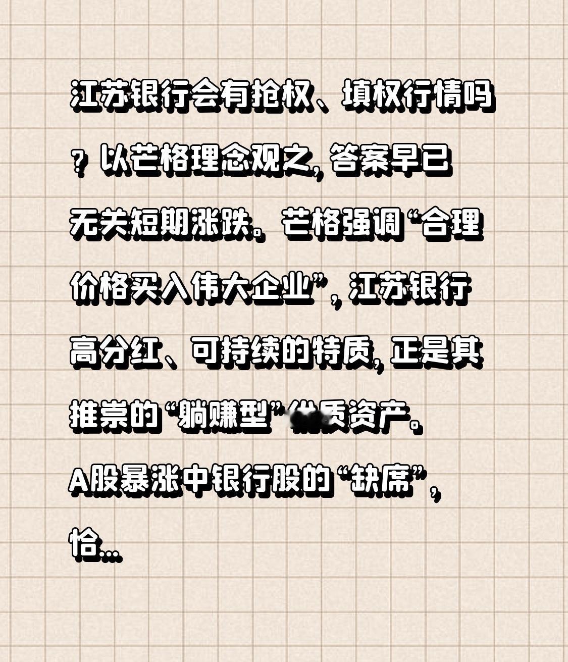江苏银行会有抢权、填权行情吗? 以芒格理念观之,答案早已无关短期涨跌。芒格强调“合理价格买入伟大企业”,江苏银行高分红、可持续的特质,正是其推崇的“躺赚型”优质资产。 A股暴涨中银行股的“缺席”,恰是对人性的考验。那些熊市赚50%、牛市仍坚定持有的投资者,践行了芒格“避免愚蠢”的智慧——远离追涨杀跌的零和博弈,聚焦企业本质而非股价噪音。 抢权、填权只是短期波动,复利才是财富核心。坚守高分红银行股,赚场外确定红利,方能在A股穿越周期。