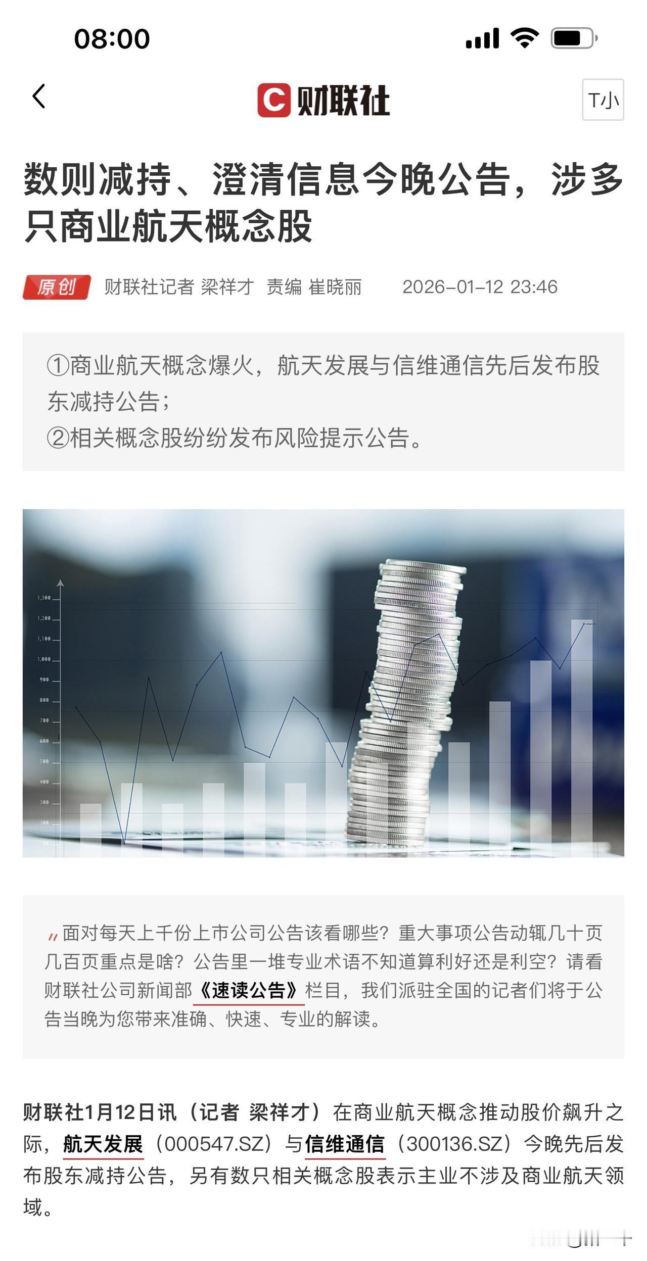 商业航天板块主动降温注意风险! 商业航天板块大涨后密集减持: 金风科技、信维通信、航天发展赫然在列。 另外多家公司澄清无商业航天业务: 航天动力、航天工程、星环科技、航天长峰。 商业航天但板块成交量达到7500亿, 超过9.24之前沪深两市全天成交量, 可见人气火到无以复加, ETF才2个月就涨翻倍! 跨年大题材第一阶段的牛市演绎到极致, 随之而来就要注意赛道拥挤问题。 这玩意要信就早信、 现在不能谈格局相反要注意风险。