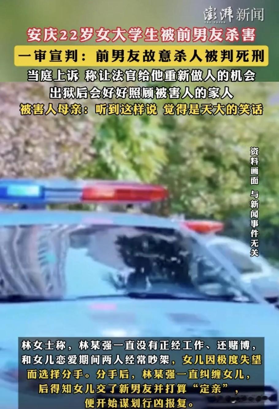 安庆22岁女大学生被杀最终结局来了! 死刑!罪有应得!笑话!凶手听到被宣布死刑后哀求法官给他重新做人的机会,发誓出狱后会好好照顾死者家人!安庆22岁女大学生被前男友杀死一案有了定局! 被判死刑了也知道害怕了,也知道活着比什么都好也知道生命的宝贵了,但是这样的悔悟太晚了,你把前女友残忍杀死,就没给自己留下继续活着的希望,这样的悲剧,我们暂且不去思考他们分手原因的谁对谁错,因为这个和是否被判死刑没有任何关系,你对不起女友,你就更不该杀死她,女友对不起你,更不必为她付出自己的生命,无论谁对不起谁,杀人都是杀死自己。(信息来源:澎湃新闻) 木叔的看法是,凶手被判死刑是他罪有应得,最后的哀求也许只是明知无望也做最后的争取,虽然活下去的欲望很强,但是自己断送了自己的生命,再做这样的哀求确实是个笑话。