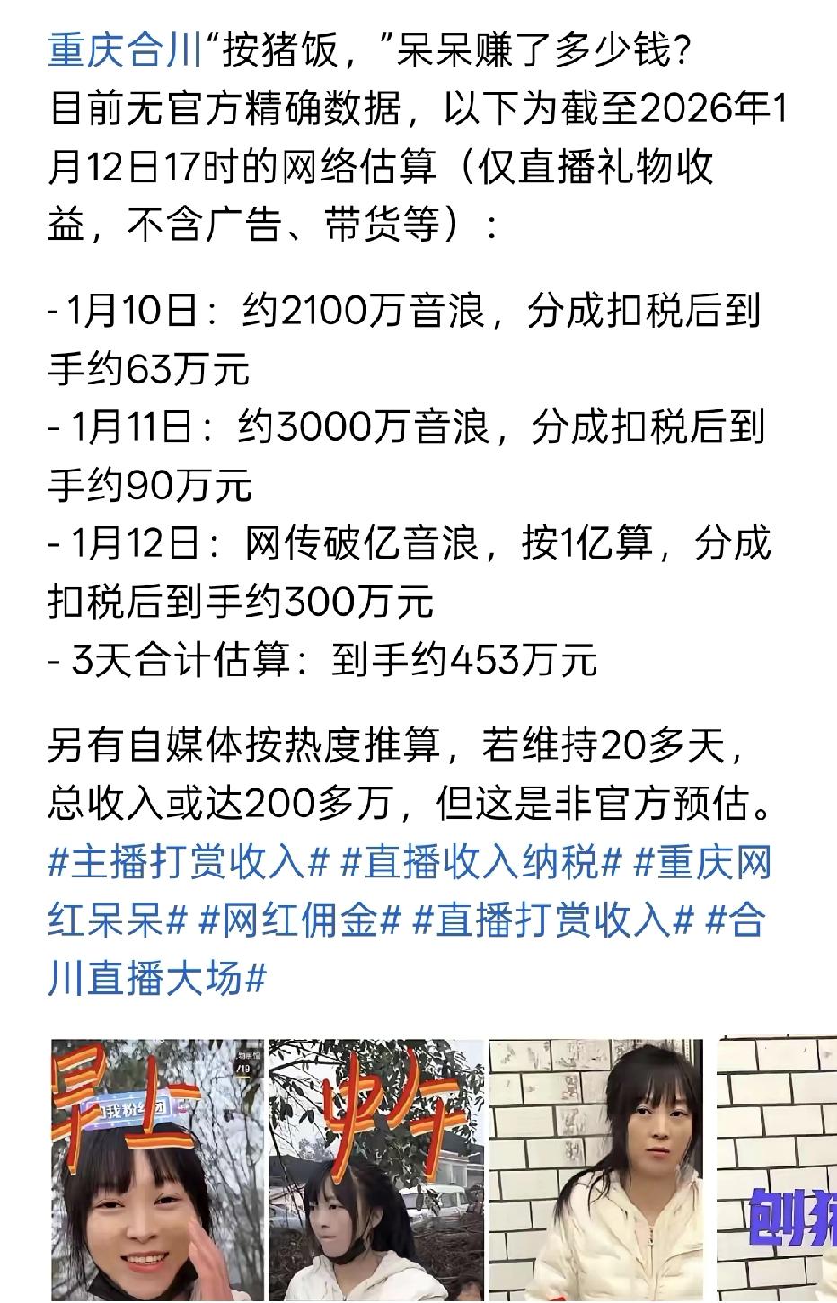 在这三天的直播间当中,呆呆里面的大哥们刷的打赏礼物,是停不下来的。有人总结了一下: 第一天大概能拿到63万。 第二天大概能拿到90万。 第三天大概能拿到300万 这三天加起来就是453万元,这还是保守估计的算法,如果再加上其他的收入,都远远不止这个数。 可以在短短几天时间内,就成为了百万富翁的人了,改写了自己的人生轨迹,这个都是命好啊。 有了这个钱,呆呆也不需要再开美甲店了,家里的艰苦条件也可以改善一下了……