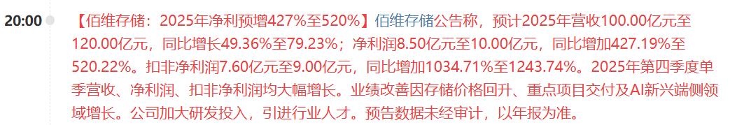 存储重大利好!明天有望带领板块长虹? 刚刚存储上市公司佰维存储发布了2025年的业绩预告,业绩可以说是相当亮眼,甚至炸裂! 内容显示,预计2025年营收100.00亿元至120.00亿元,同比增长49.36%至79.23%;净利润8.50亿元至10.00亿元,同比增加427.19%至520.22%。扣非净利润7.60亿元至9.00亿元,同比增加1034.71%至1243.74%。 净利润同比增长了4倍到5倍,扣非净利润更是直接暴涨10倍到12倍! 大家看佰维存储这个业绩,是不是相当的亮眼?是不是相当的炸裂? 关键是佰维存储3季报的时候,都不好看。三季报净利润同比负增长86%,扣非净利润更是同比负增长108%。现在到了第四季度,业绩直接来了一个大逆转! 这直接说明第四季度公司存储产品必然是涨的吓人! 公司公告也讲了,2025年第四季度单季营收、净利润、扣非净利润均大幅增长。 众所周知,第四季度以来,内存板块是各种涨价消息不断,各种供不应求。内存出现了史上最强的超级周期。 这不比什么商业航天更有看头?更香? 虽然说商业航天未来前景不错,但是离兑现业绩还八字没有一撇呢? 而存储板块则是实打实的业绩暴增。 所以明天A股存储应该有望顺势长虹!