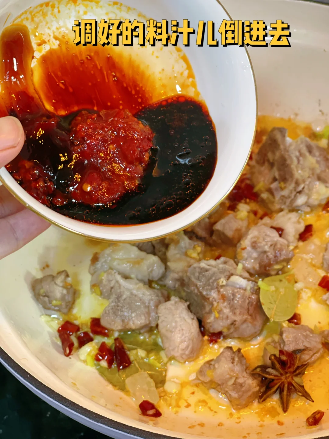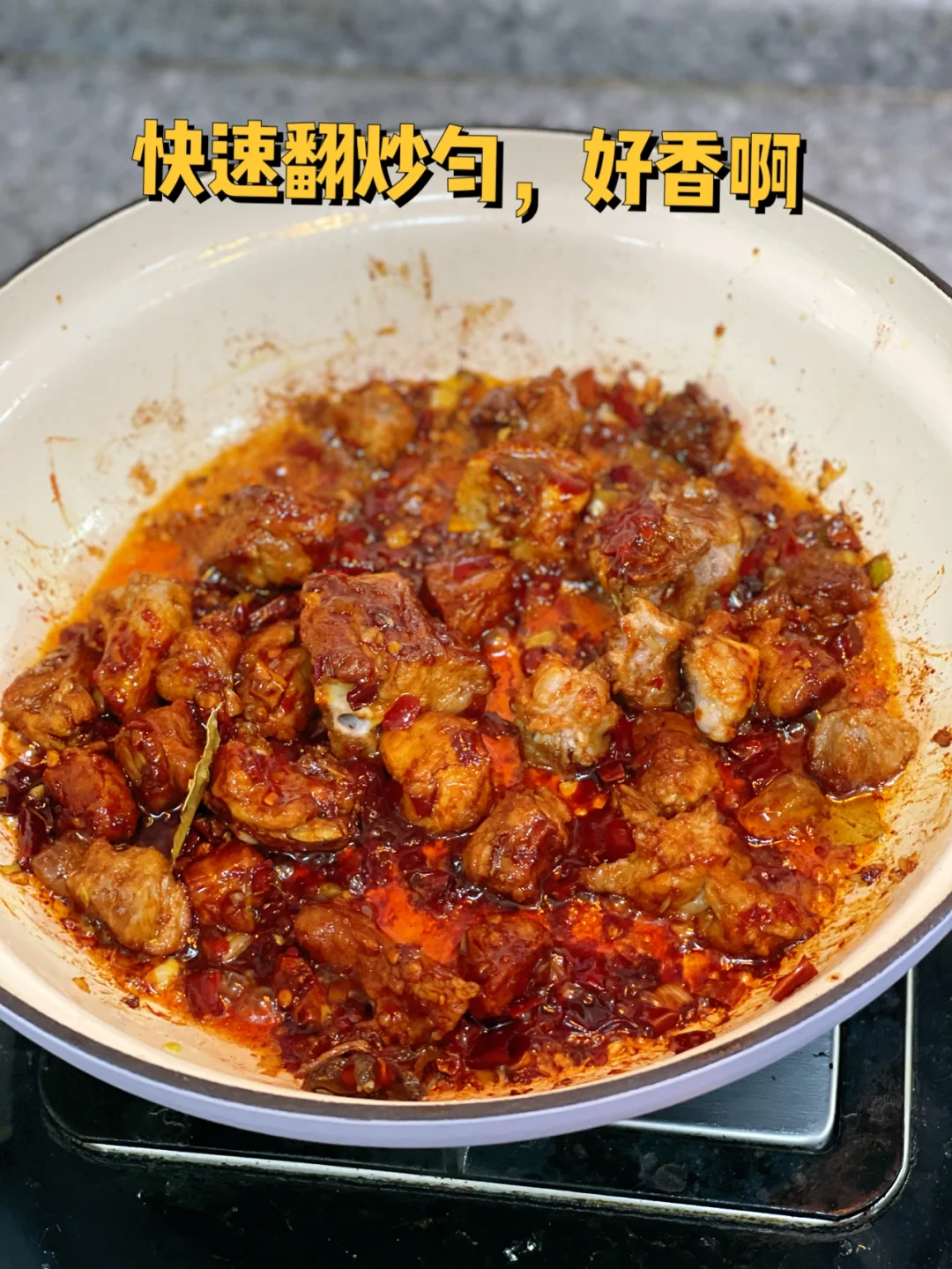 4. 大蒜生姜干辣椒小火煸炒香,加入排骨少许冰糖和八角香叶继续炒