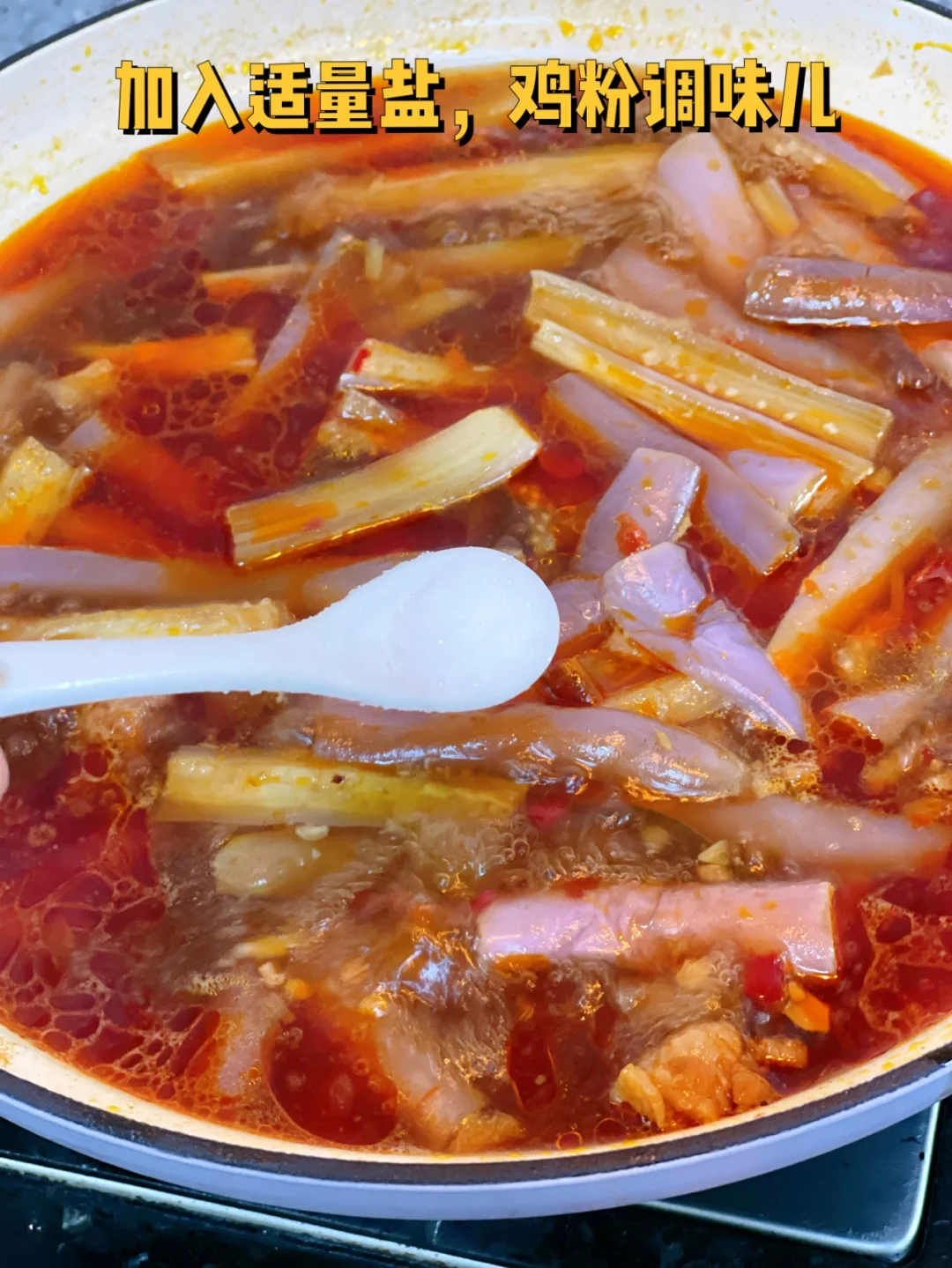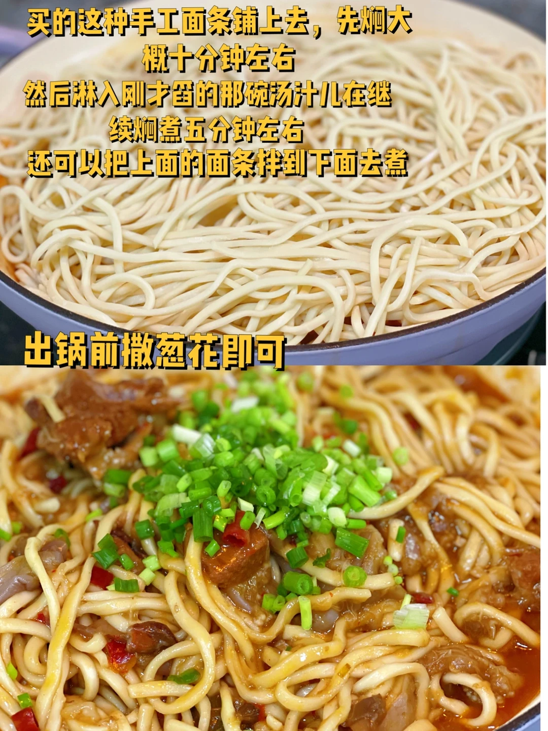 10. 买的这种手工面条铺上去,先焖大概十分钟左右,然后淋入刚才舀的那碗汤汁儿在继续焖煮五分钟左右,还可以把上面的面条拌到下面去煮