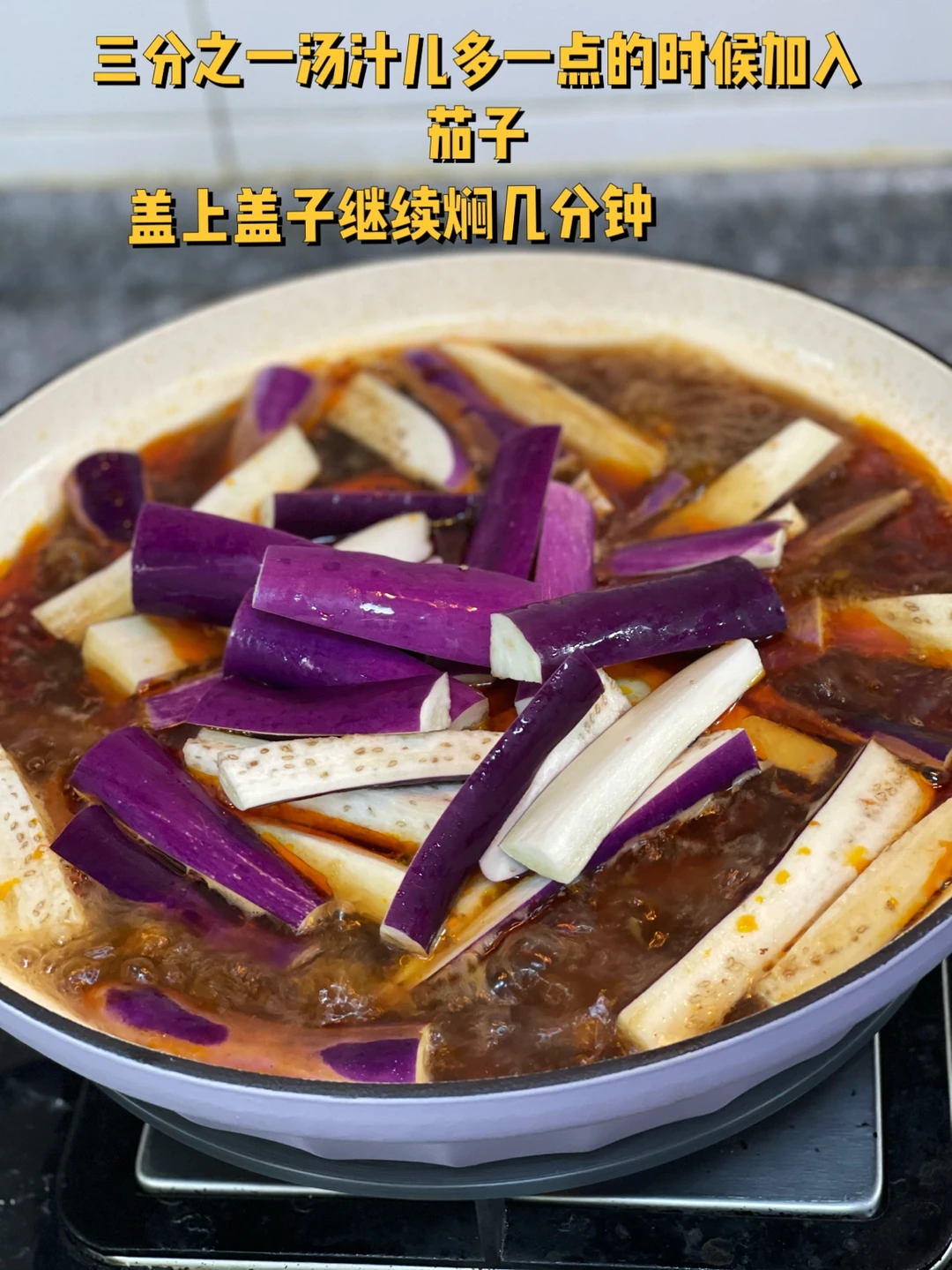 8. 三分之一汤汁儿多一点的时候加入茄子,盖上盖子继续焖几分钟