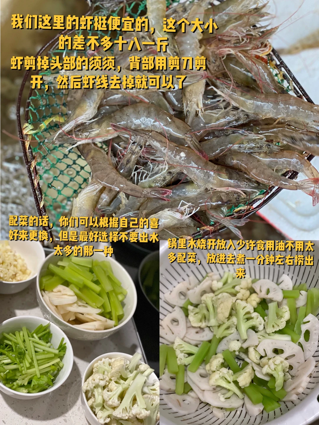 1. 我们这里的虾挺便宜的,这个大小的差不多十八一斤,虾剪掉头部的须须,背部用剪刀剪开,然后虾线去掉就可以了