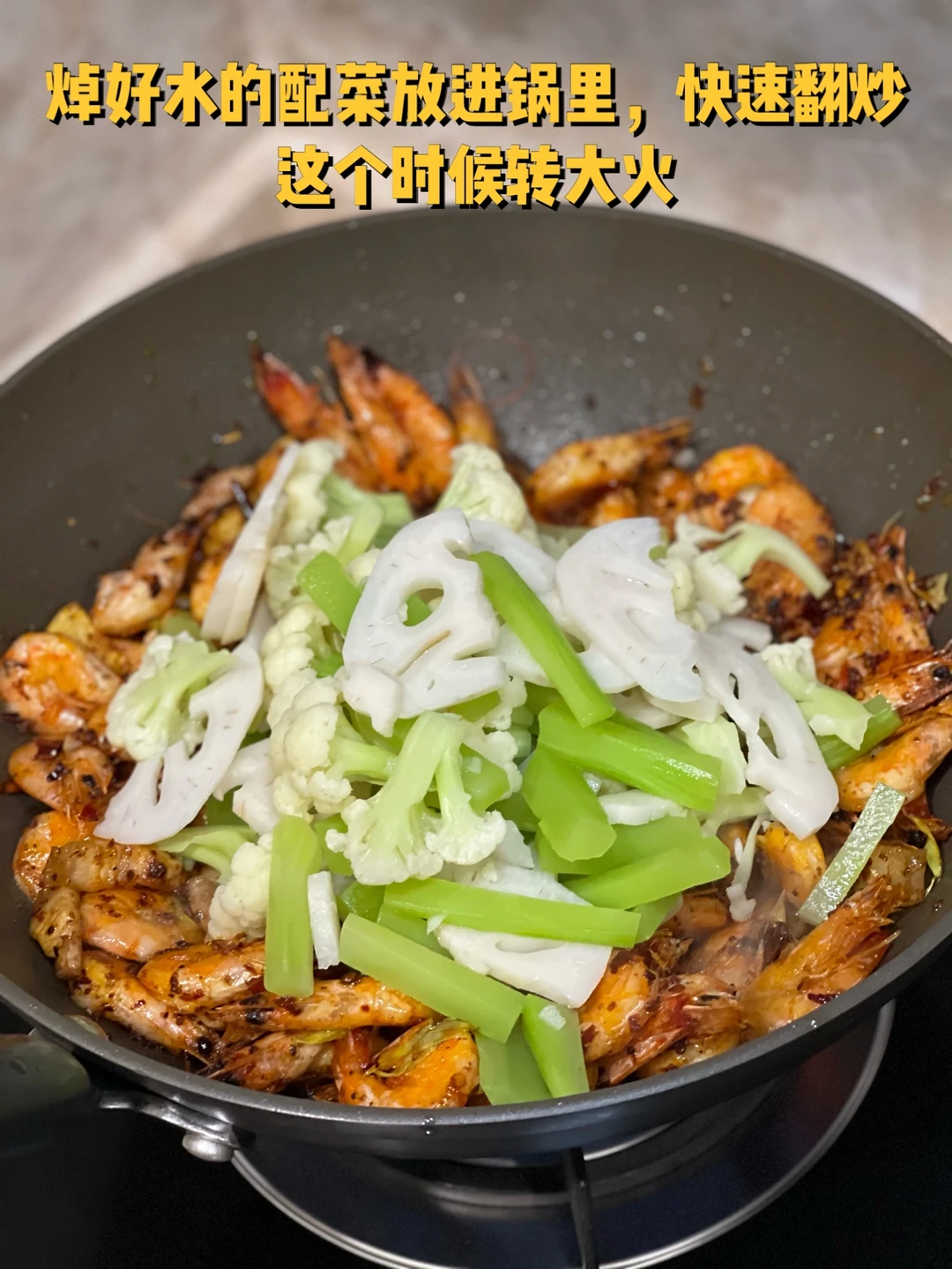 7. 焯好水的配菜放进锅里,快速翻炒这个时候转大火