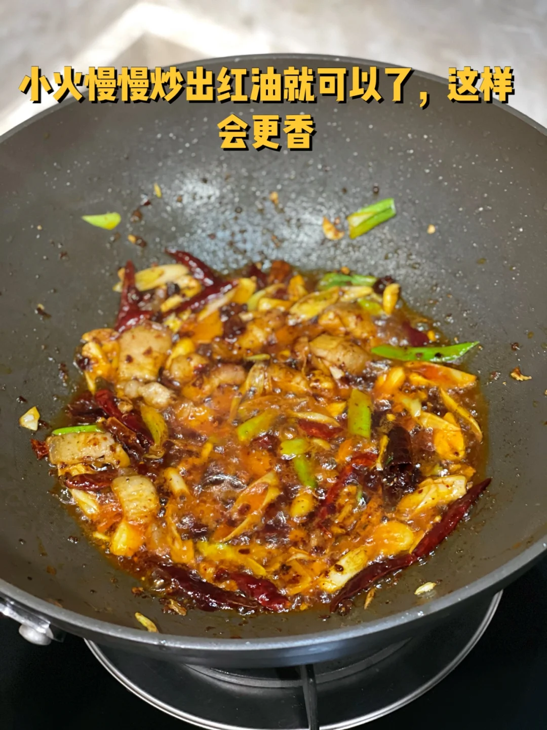 6. 小火慢慢炒出红油就可以了,这样会更香