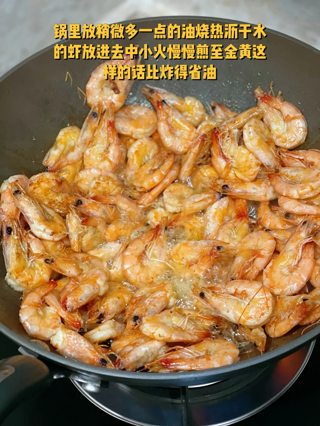 4. 锅里放稍微多一点的油烧热沥干水的虾放进去中小火慢慢煎至金黄这样的话比炸得省油