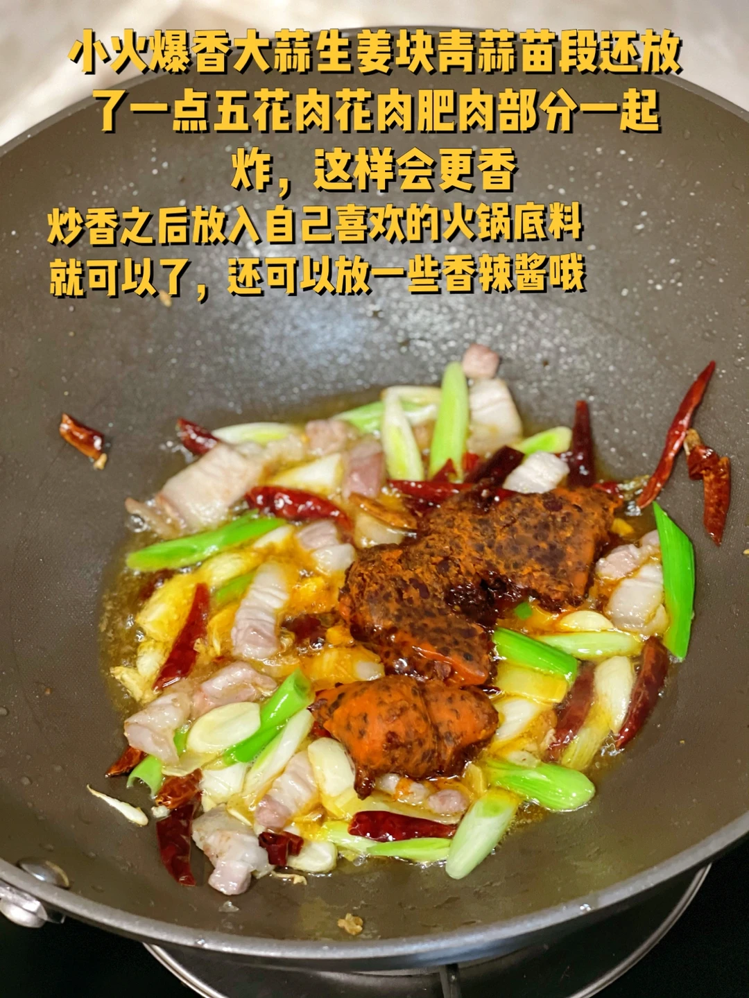 5. 小火爆香大蒜生姜块青蒜苗段还放了一点五花肉花肉肥肉部分一起炸,这样会更香,炒香之后放入自己喜欢的火锅底料就可以了,还可以放一些香辣酱哦