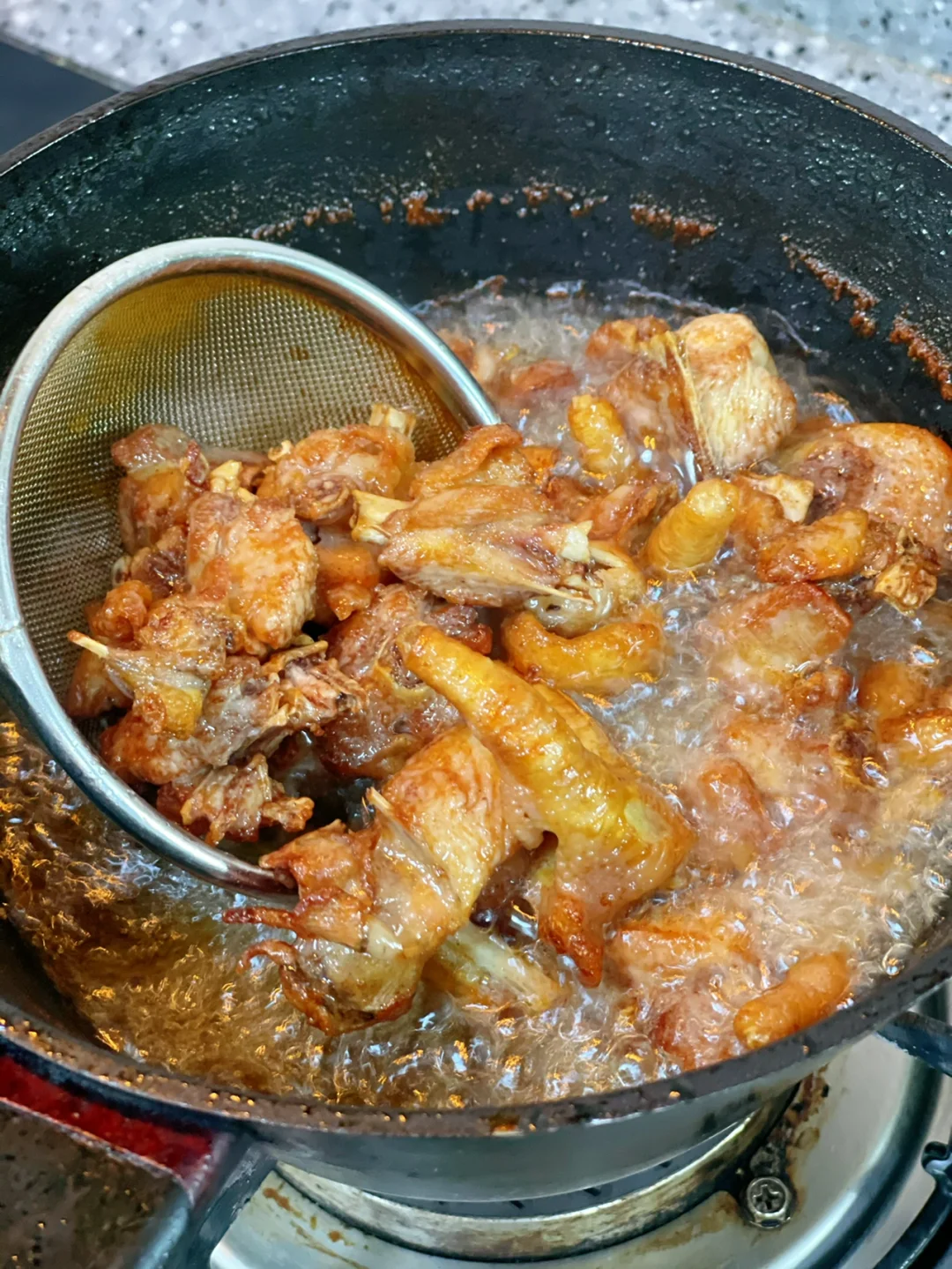 6. 炸东西要想省油就用底口窄一点深一点的锅炸东西比较好,油烧热放入鸡块进去大火开始炸