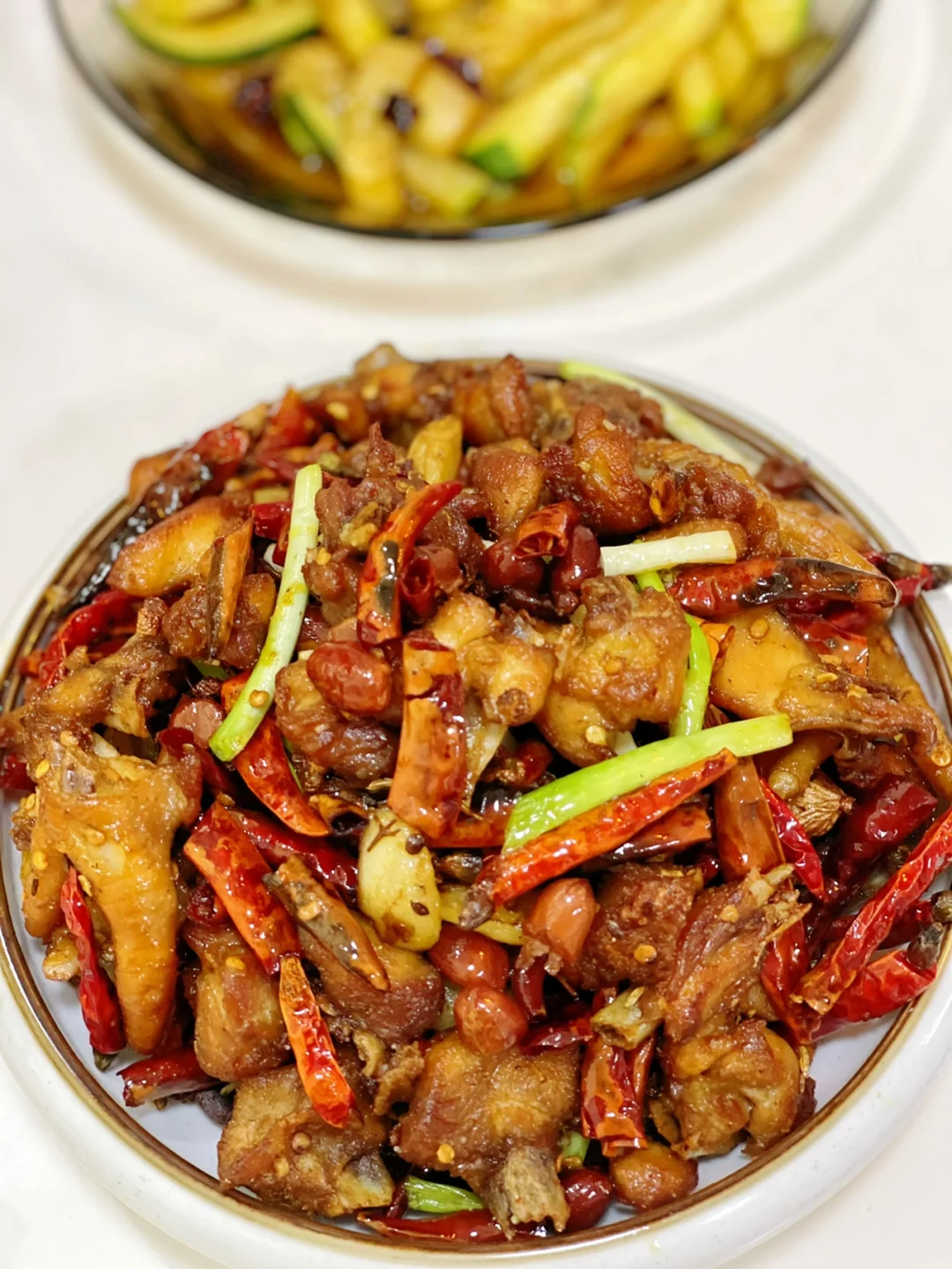 10. 再把炸好的鸡块放进去加入一勺料酒一勺生抽