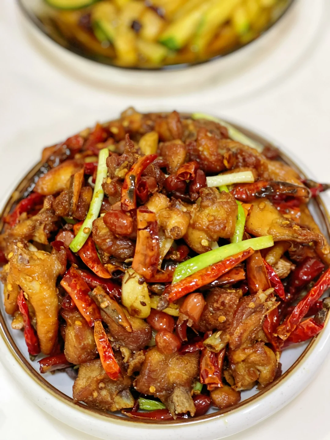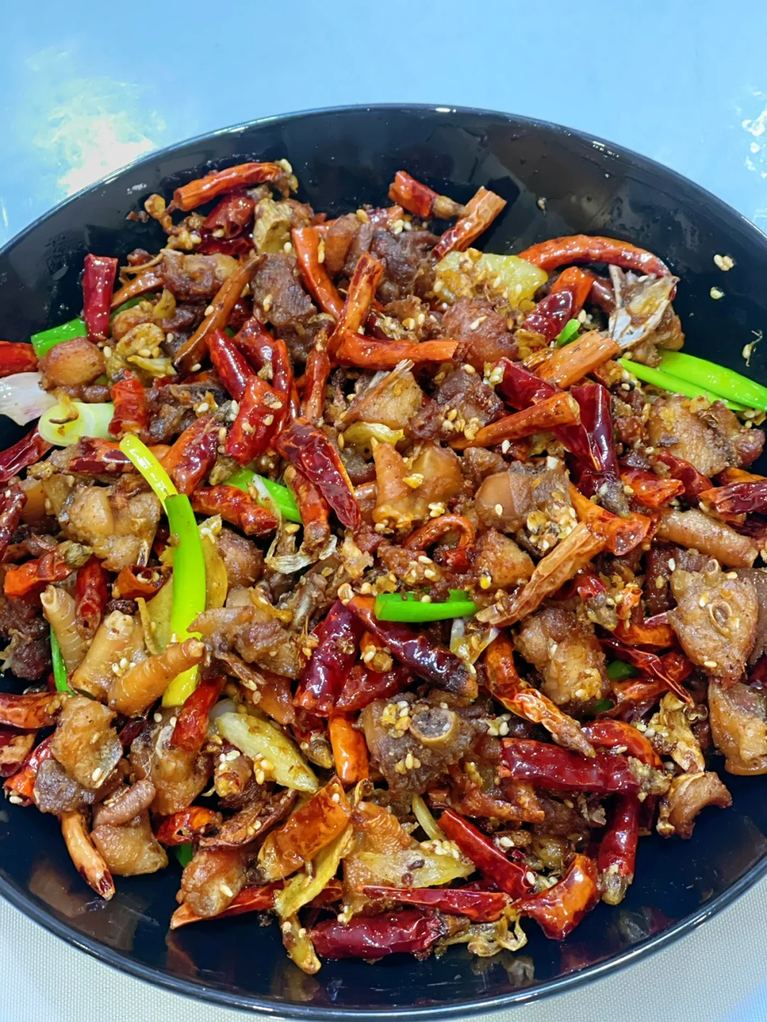 11. 加入适量糖,五香粉,加入适量盐鸡粉出锅前撒葱花段,好吃的辣子鸡就做好啦