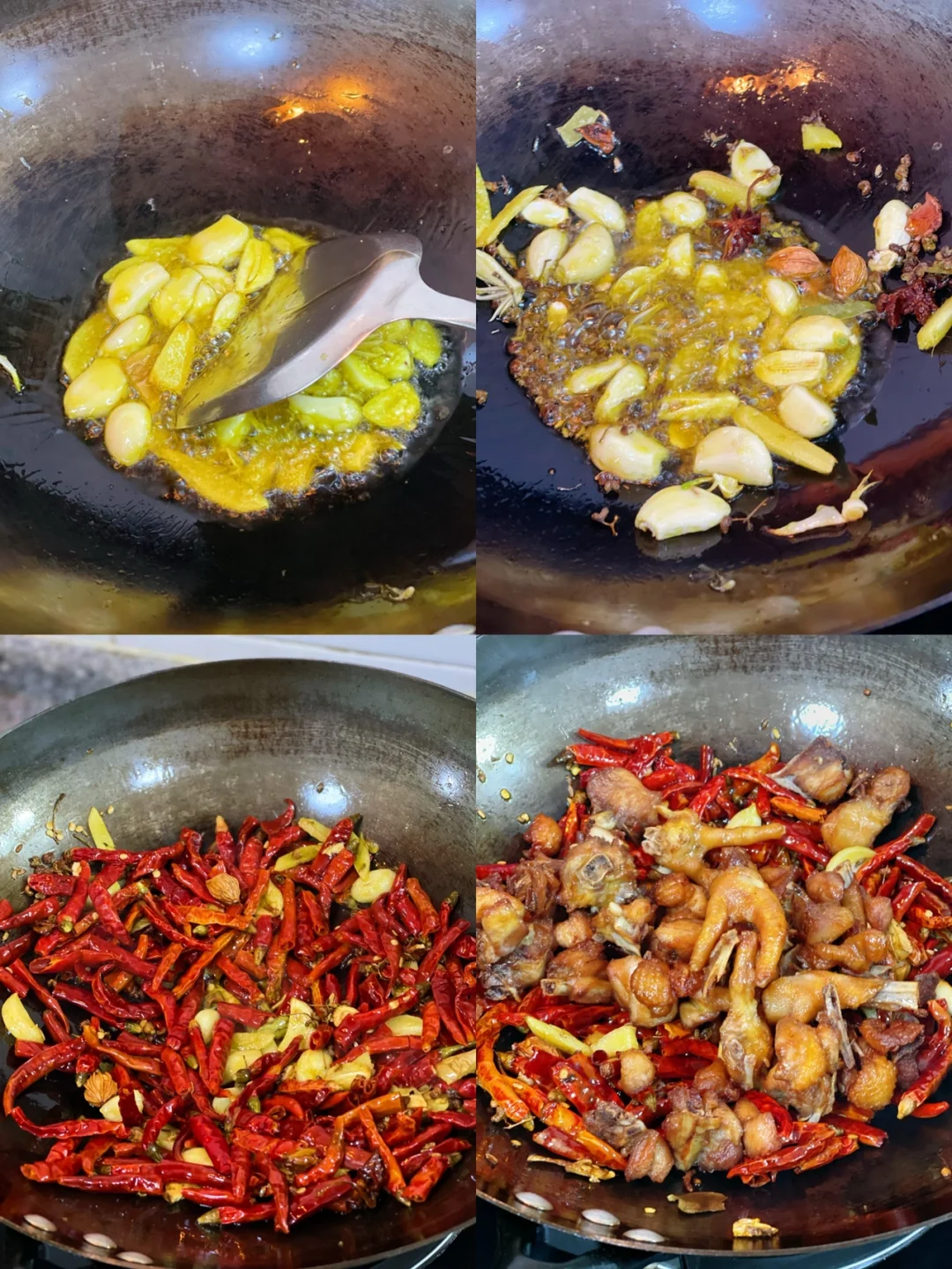 9. 再把沥干水的干辣椒放进去一起炒两分钟至辣椒出味,这个时候不能太大火噢容易糊