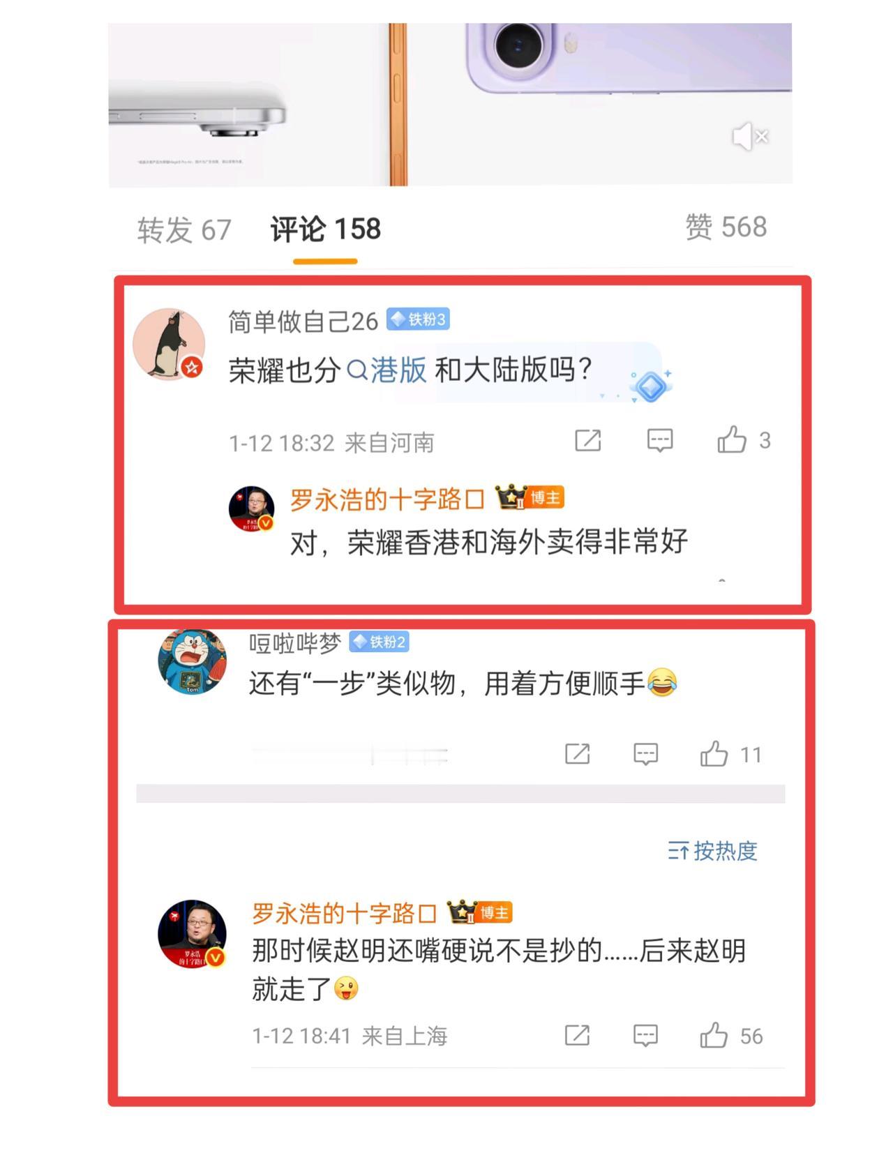 罗永浩再谈荣耀。 1月12日,罗永浩在评论区与网友互动。有网友问他:“荣耀也分港版和大陆版吗?”罗永浩回答说:“对,荣耀在香港和海外卖得非常好。” 另有网友幽默地给老罗留言:“还有‘一步’类似物,用着方便顺手。”老罗回复:“那时候赵明还嘴硬说不是抄的,后来赵明就从荣耀离开了。” 这里简要说明一下背景:此前罗永浩曾公开喊话荣耀,称锤子科技的“One Step”功能被对方抄袭,当时仍在荣耀任职的赵明曾发文回应。 尽管如今赵明已离开荣耀,但时隔两年,罗永浩不仅夸赞荣耀手机,还表示自己想入手一台,双方此前的争议似已淡化。