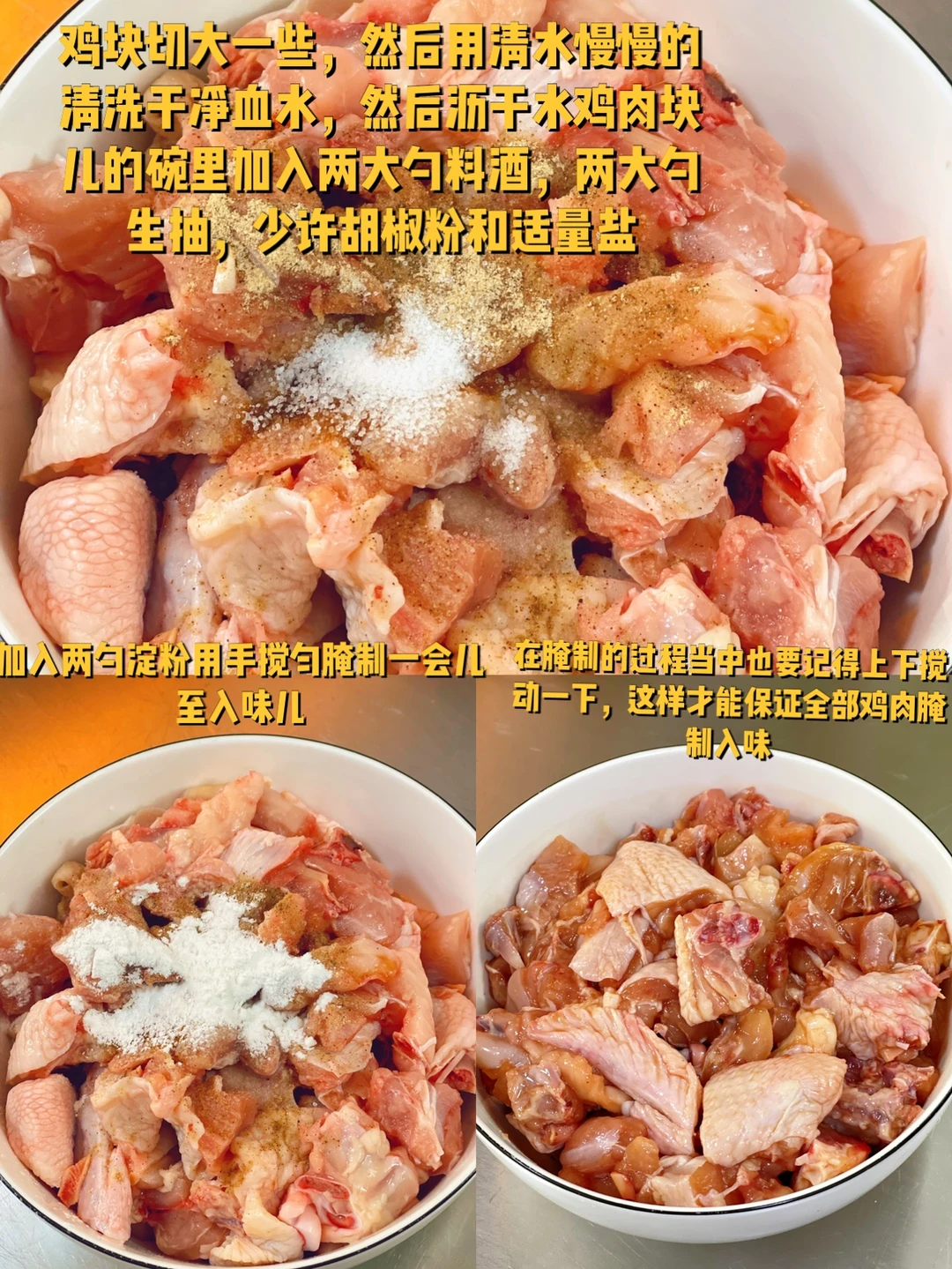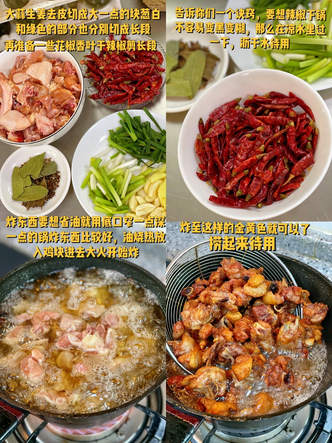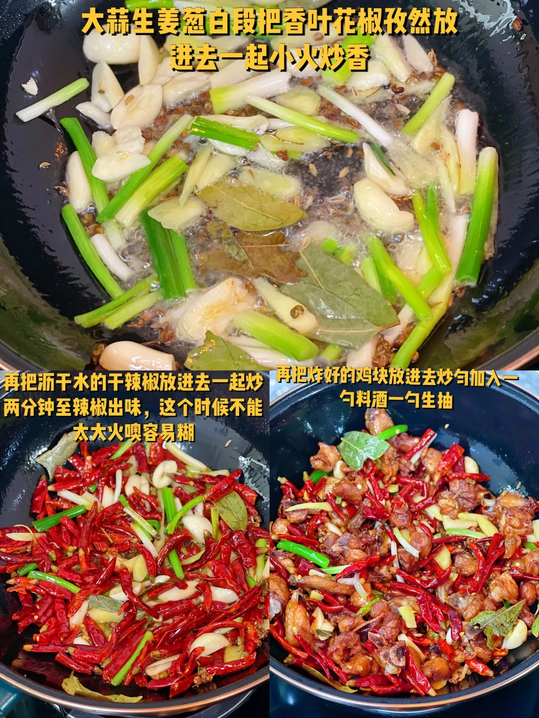 1. 鸡块切大一些,然后用清水慢慢的清洗干净血水,然后沥干水鸡肉块儿的碗里加入两大勺料酒,两大勺生抽,少许胡椒粉和适量盐 2. 加入两勺淀粉用手搅匀腌制一会儿至入味儿 3. 在腌制的过程当中也要记得上下搅动一下,这样才能保证全部鸡肉腌制入味 4. 大蒜生姜去皮切成大一点的块葱白和绿色的部分也分别切成长段,再准备一些花椒香叶干辣椒剪长段 5. 告诉你们一个诀窍,要想辣椒下锅不容易变黑变糊,那么在凉水里过一下,沥干水待用 6. 炸东西要想省油就用底口窄一点深一点的锅炸东西比较好,油烧热放入鸡块进去大火开始炸 7. 炸至这样的金黄色就可以了,捞起来待用 8. 大蒜生姜葱白段把香叶花椒孜然放进去一起小火炒香 9. 再把沥干水的干辣椒放进去一起炒两分钟至辣椒出味,这个时候不能太大火噢容易糊 10. 再把炸好的鸡块放进去加入一勺料酒一勺生抽 11. 加入适量糖,五香粉,加入适量盐鸡粉出锅前撒葱花段,好吃的辣子鸡就做好啦