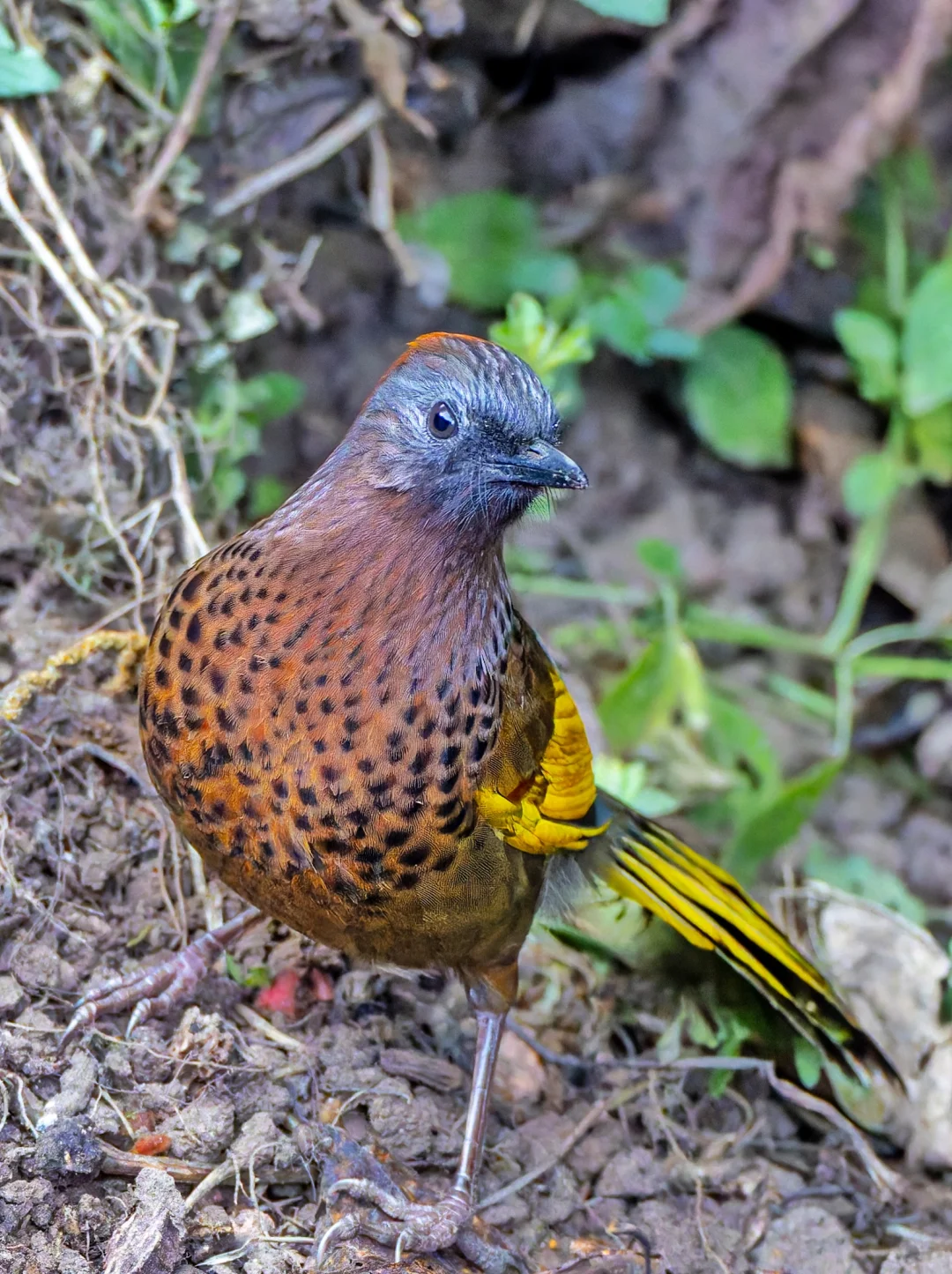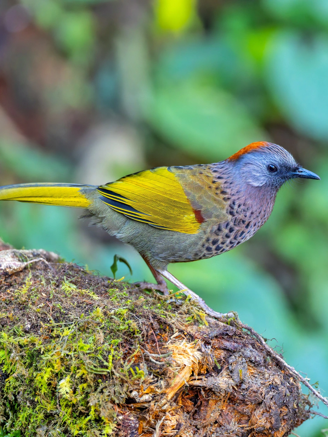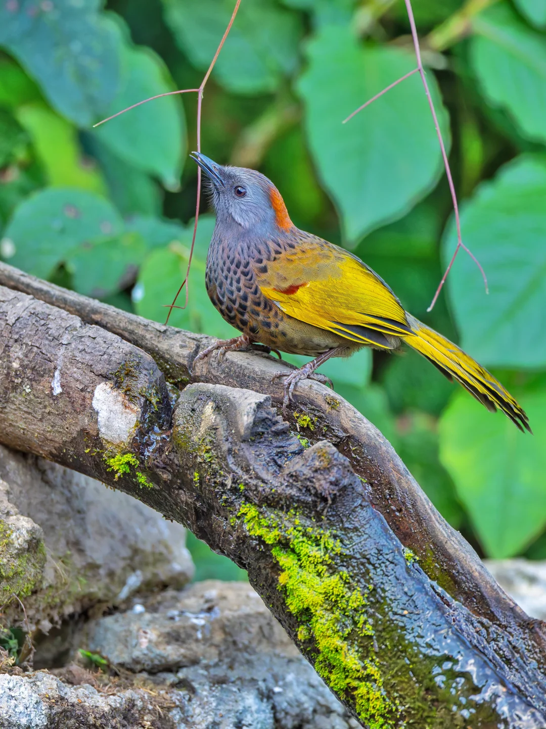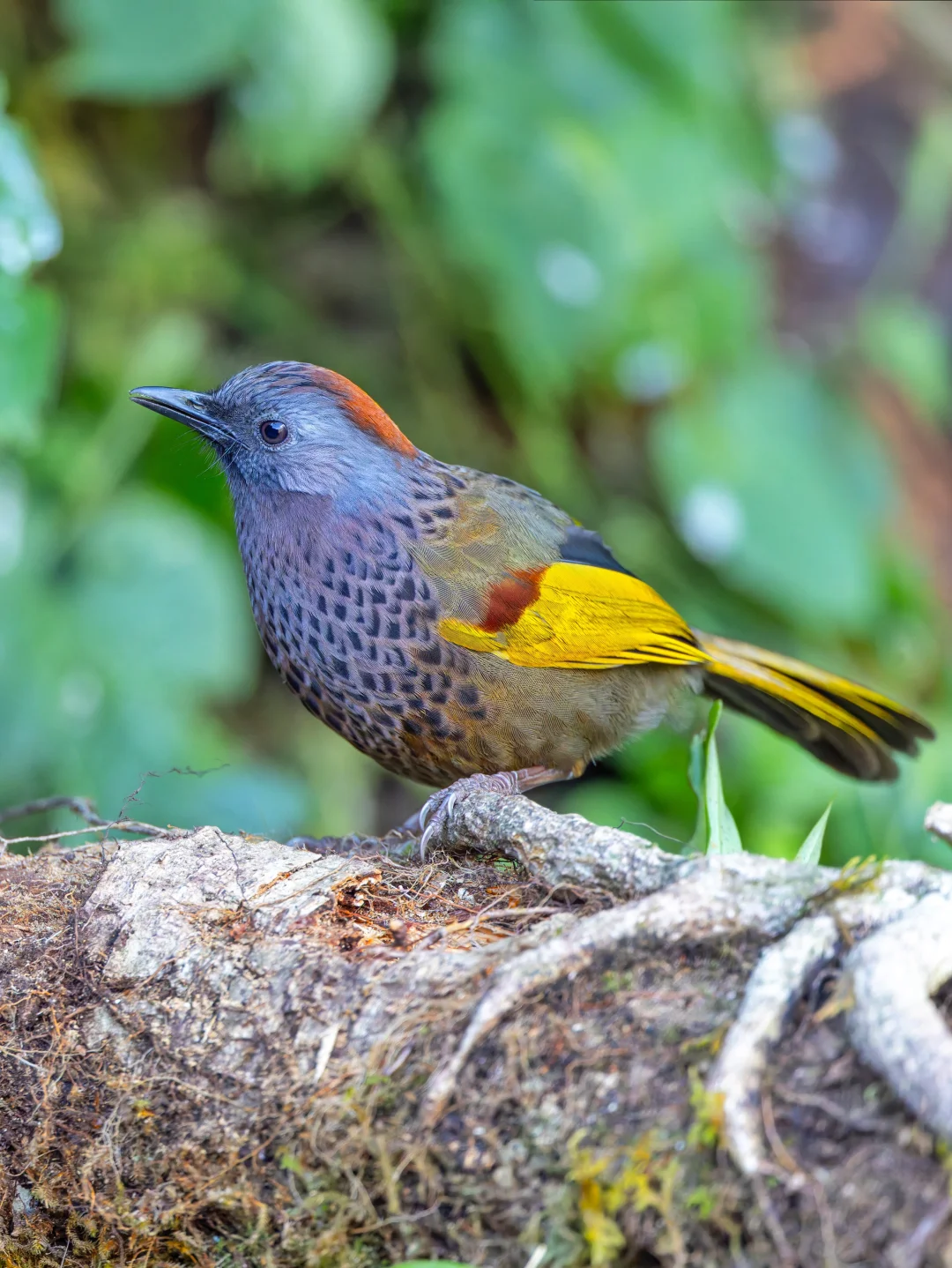 原创拍摄于2026.01 金翅噪鹛,也叫 红顶噪鹛(郑4),Assam Laughingthrush,雀形目噪鹛科彩翼噪鹛属。红头噪鹛的亚种,后来红头噪鹛分为红头噪鹛、银耳噪鹛、金翅噪鹛、马来噪鹛了。金翅噪鹛的英文名是 Assam Laughingthrush, 直译是阿萨姆噪鹛,很不厚道占了越南金翅噪鹛的中文名。学名是 Trochalopteron chrysopterum,包含 5 个亚种。分布于缅甸西南部和我国滇西。 金翅噪鹛拥有金色的翅膀和长长的金色尾巴,栖于枝头,羽翼如镀了晨光的金箔,在绿意间轻轻摇曳。