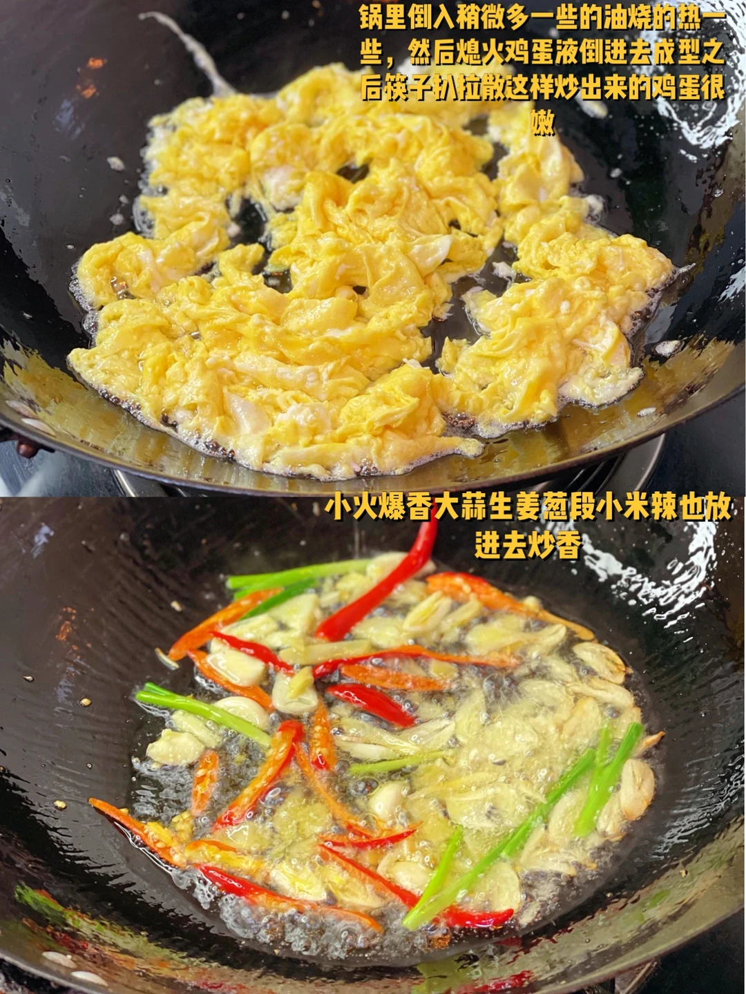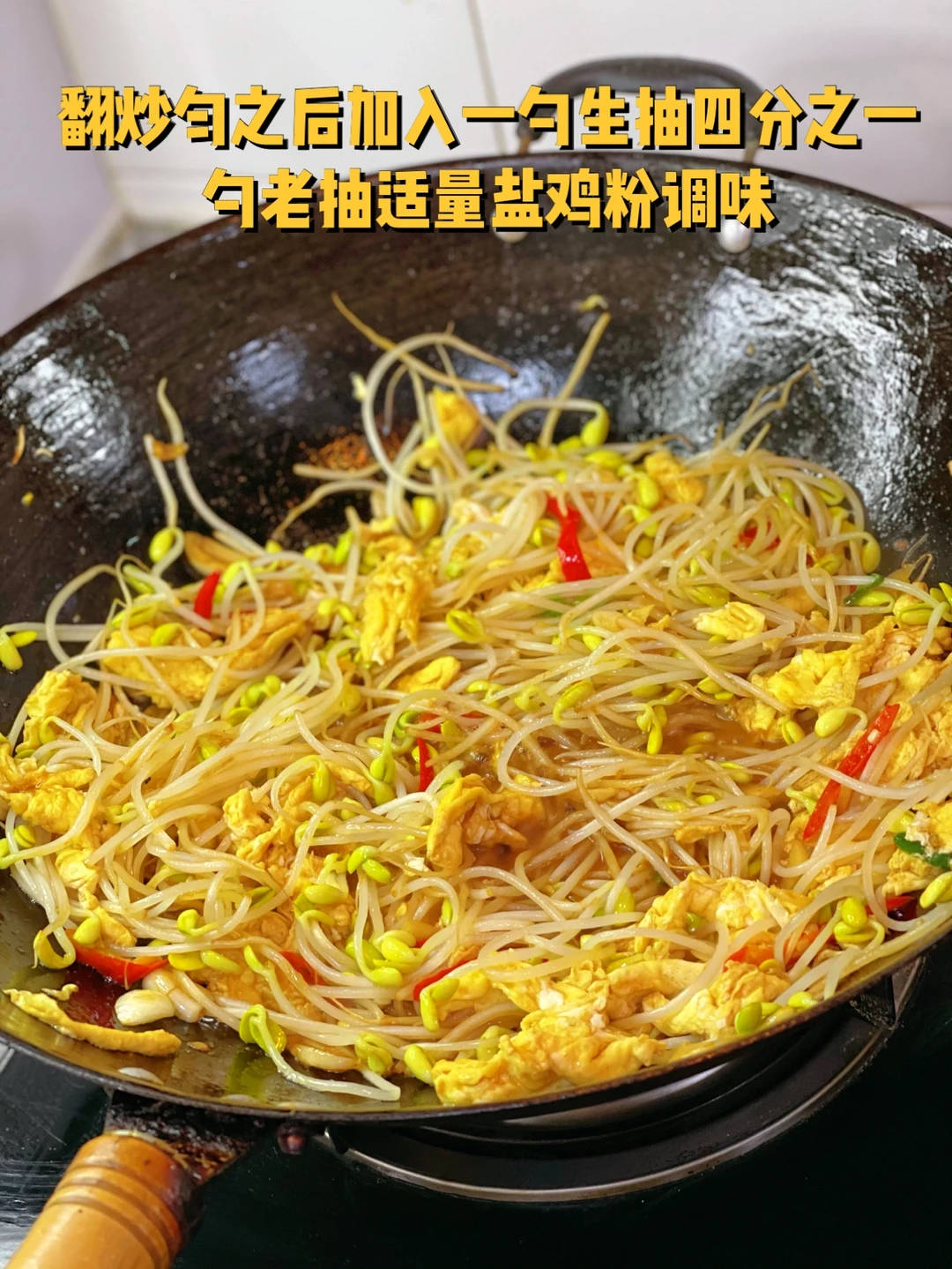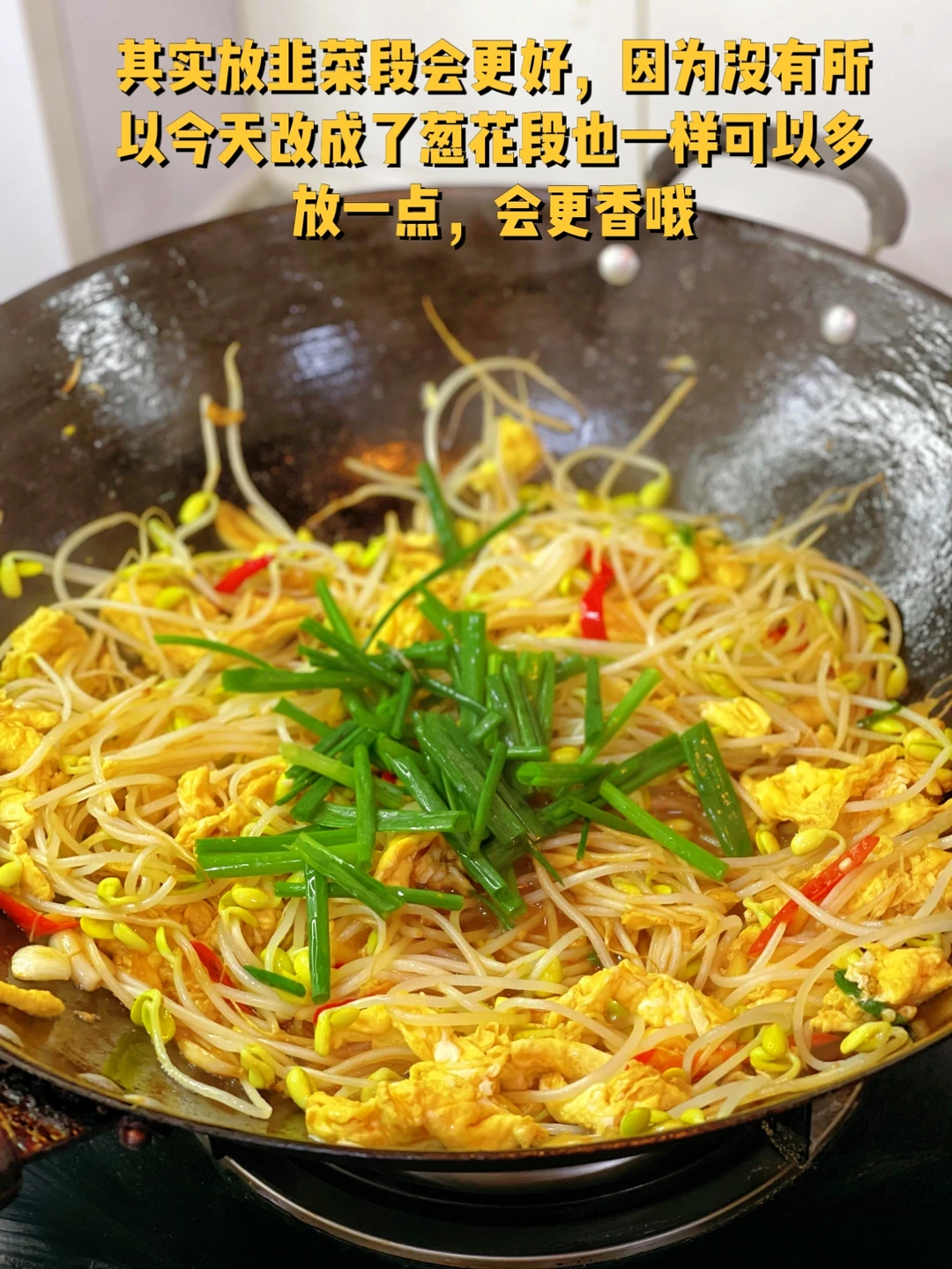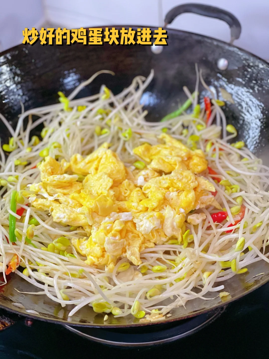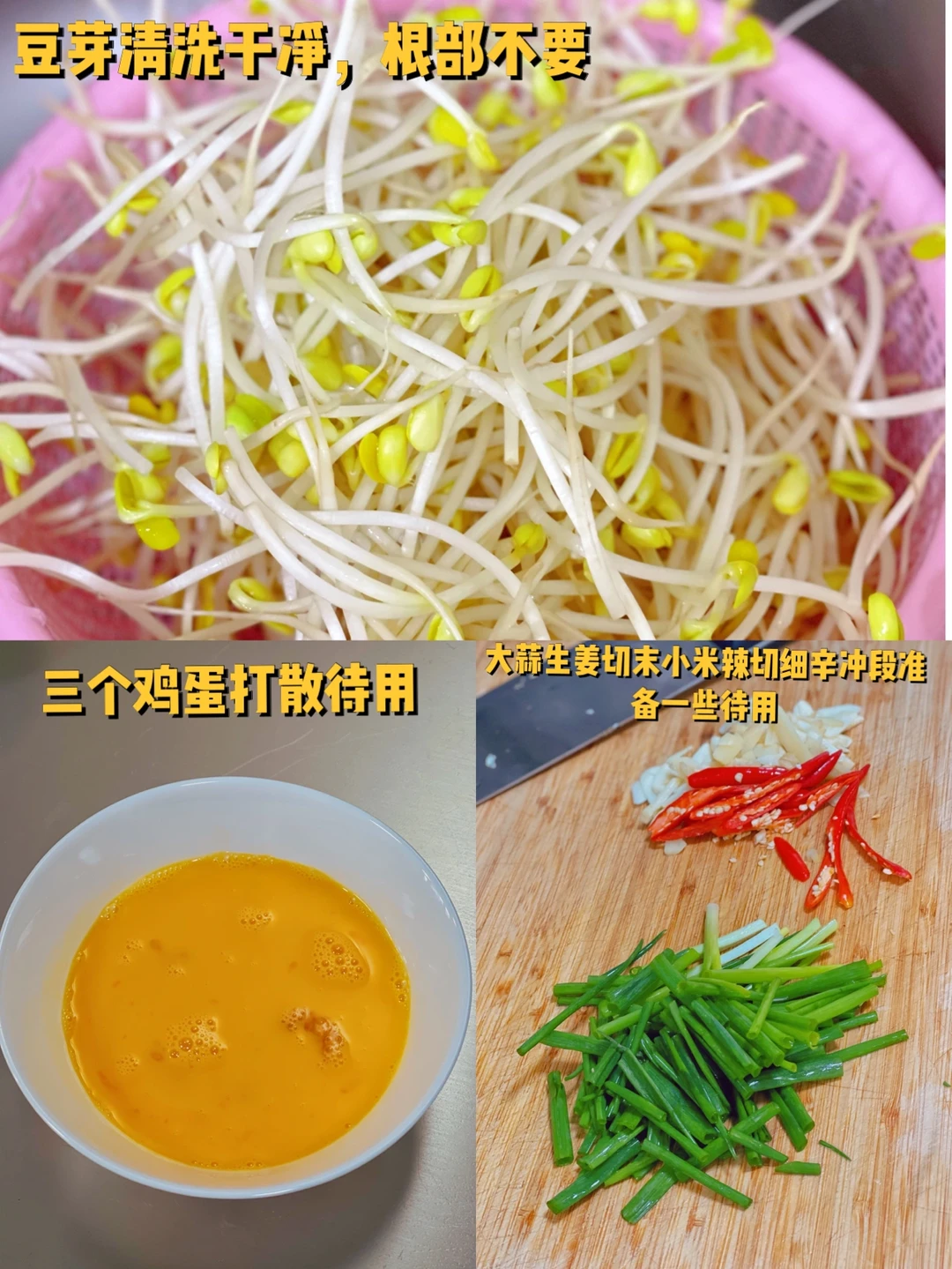 1. 豆芽清洗干净,根部不要 2. 三个鸡蛋打散待用 3. 大蒜生姜切末小米辣切细辛冲段准备一些待用 4. 锅里倒入稍微多一些的油烧的热一些,然后熄火鸡蛋液倒进去成型之后筷子扒拉散这样炒出来的鸡蛋很嫩 5. 小火爆香大蒜生姜葱段小米辣也放进去炒香 6. 沥干水的豆芽放进去翻炒两分钟 7. 炒好的鸡蛋块放进去 8. 翻炒匀之后加入一勺生抽四分之一勺老抽适量盐鸡粉调味 9.其实放韭菜段会更好,因为没有所以今天改成了葱花段也一样可以多放一点,会更香哦 10. 看着就很香吧