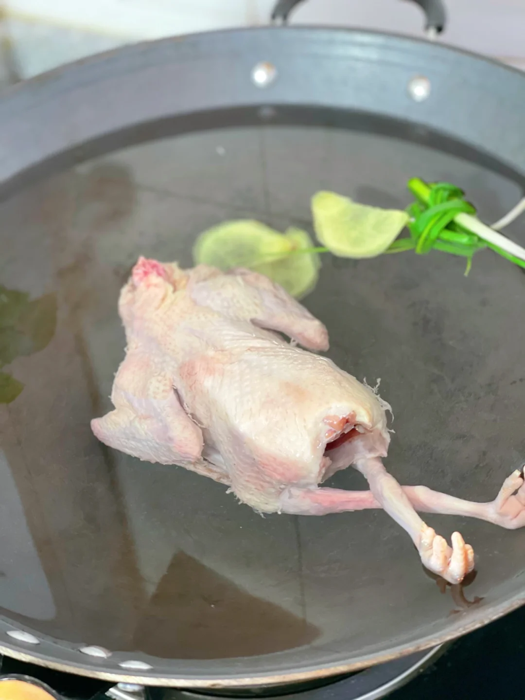 2.鸽子清理干净毛毛和内脏 冷水入锅,加入葱结和姜片 一大勺料酒开始煮