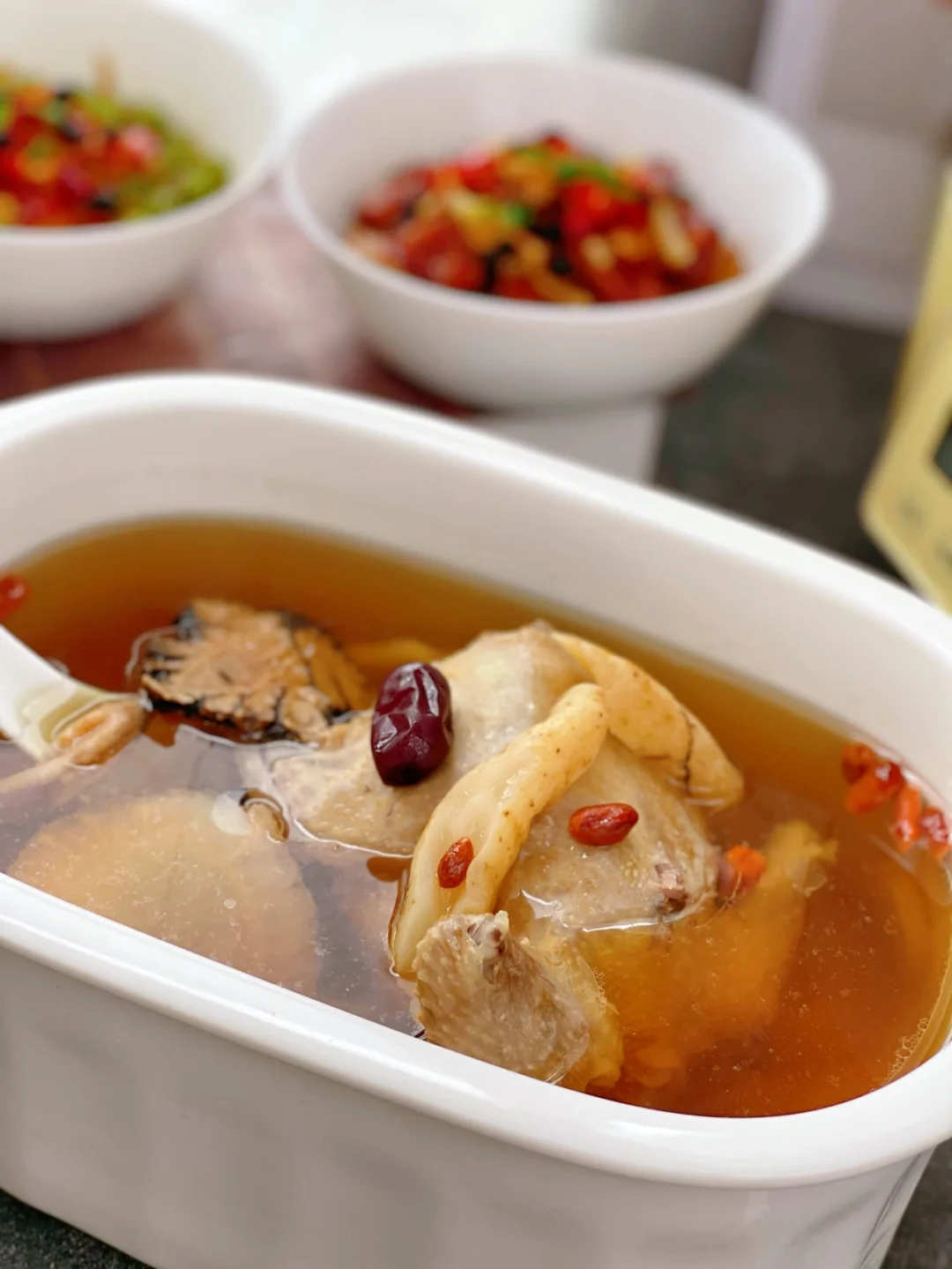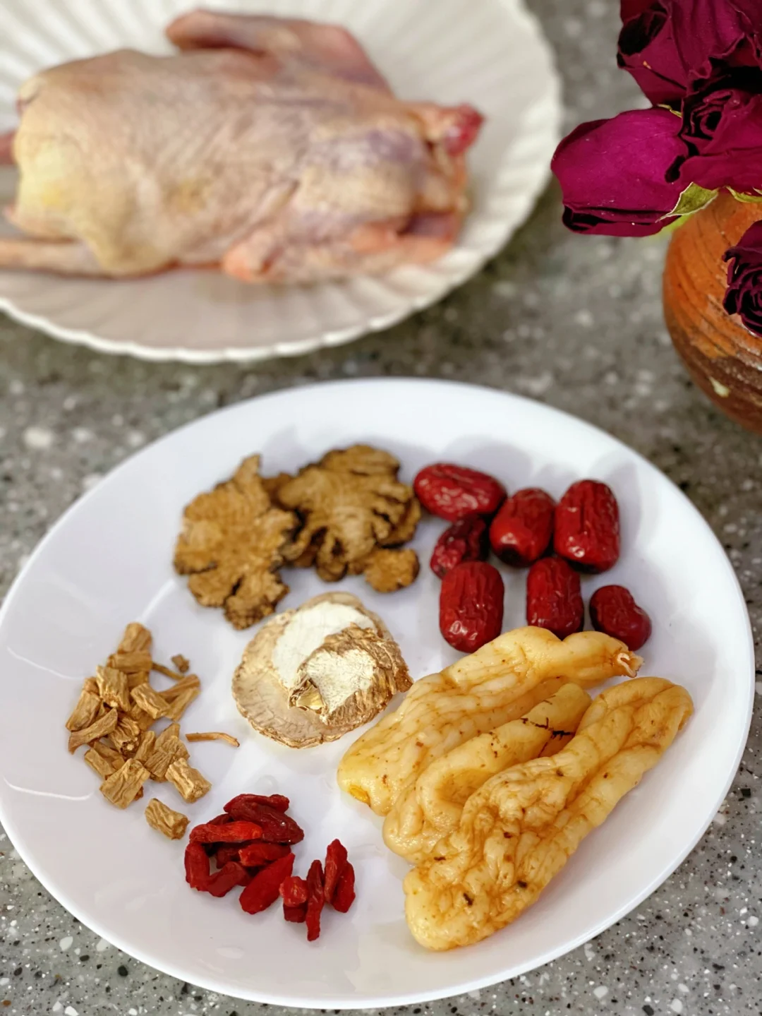 1.这里的食材有天麻[朋友拿来的时候是晒干的,我泡了一个晚上,入锅前切片了] 白芷,红枣,川芎,党参,枸杞适量