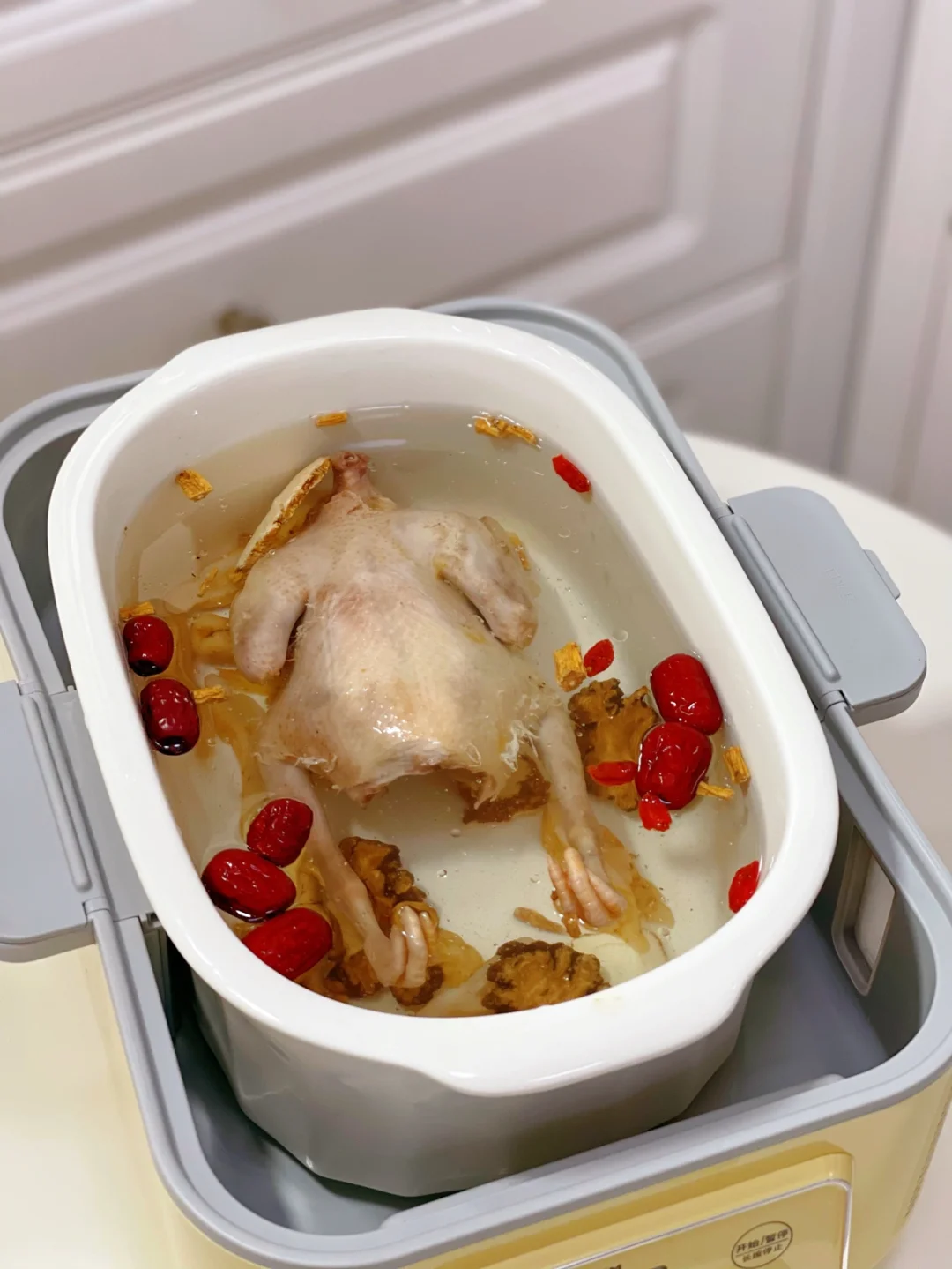 4.鸽子和配料全部放进炖盅里,如果怕上火的话红枣可以去核哦,加入适量纯净水