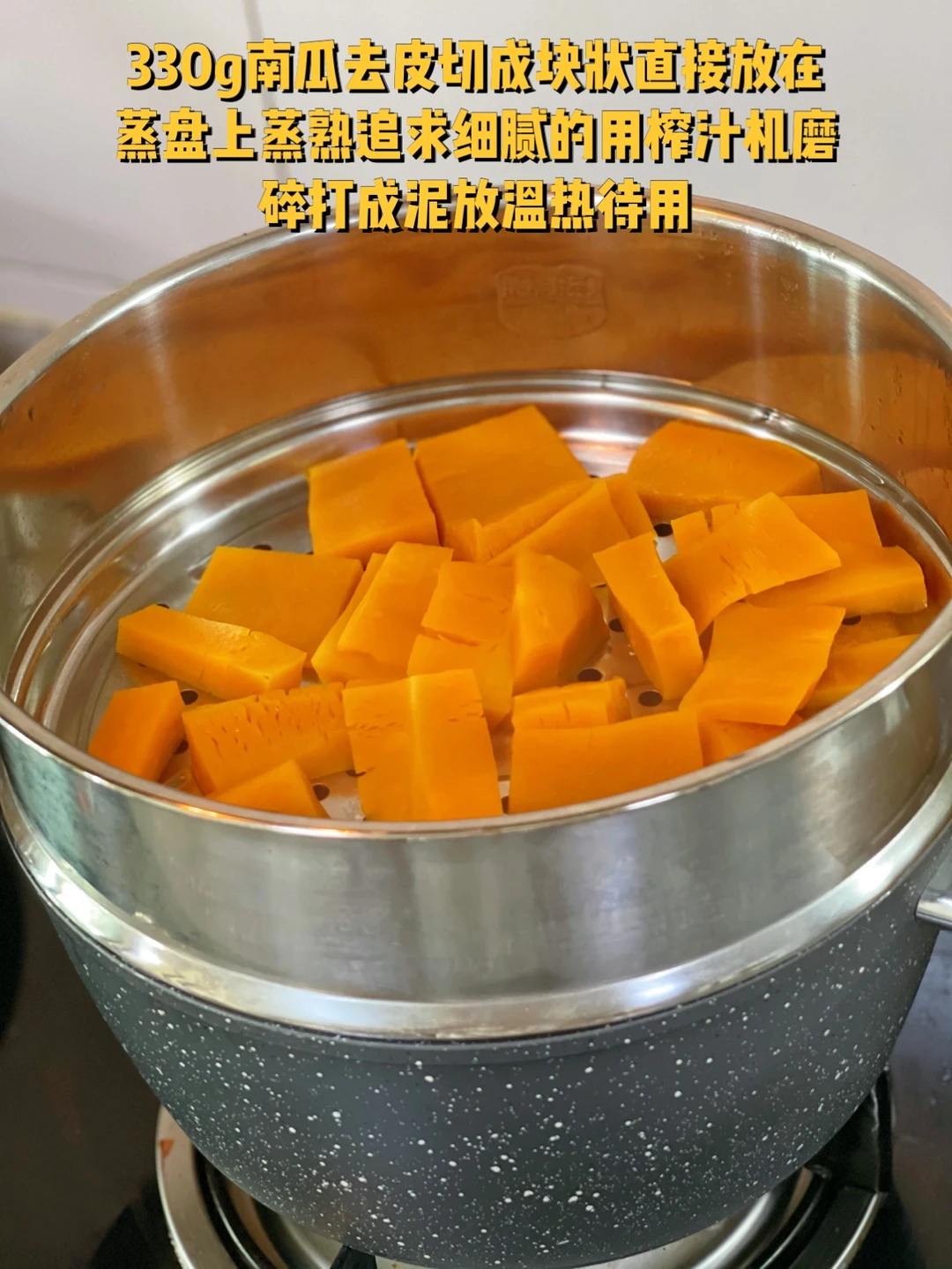 1. 330g南瓜去皮切成块状直接放在蒸盘上蒸熟追求细腻的用榨汁机磨碎打成泥放温热待用