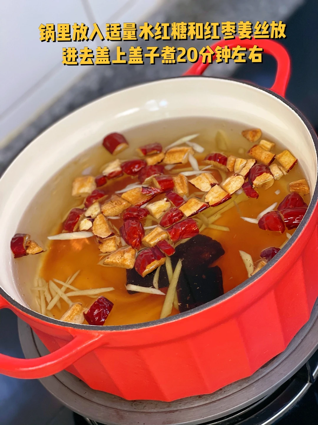 2. 锅里放入适量水红糖和红枣姜丝放进去盖上盖子煮20分钟左右