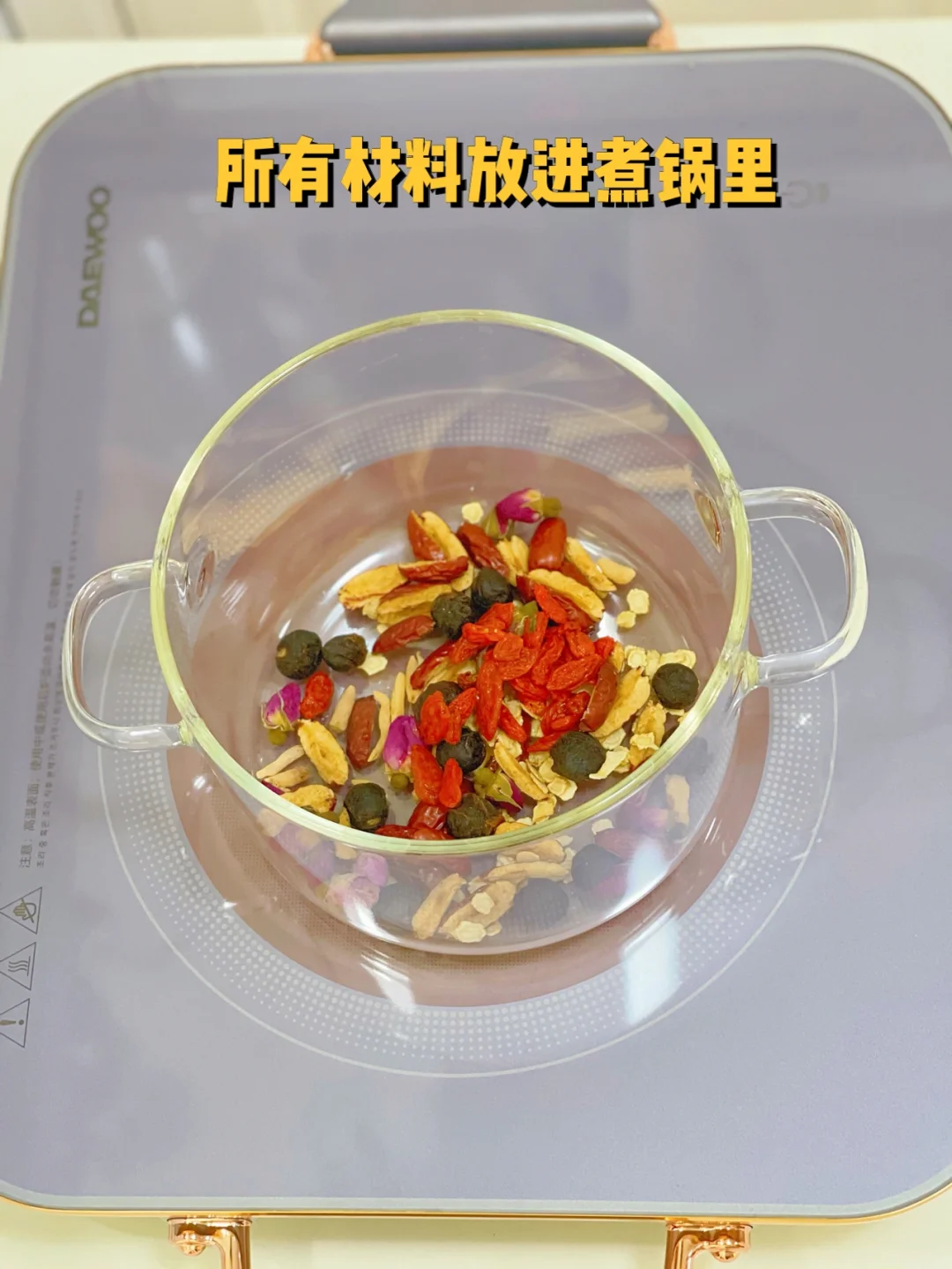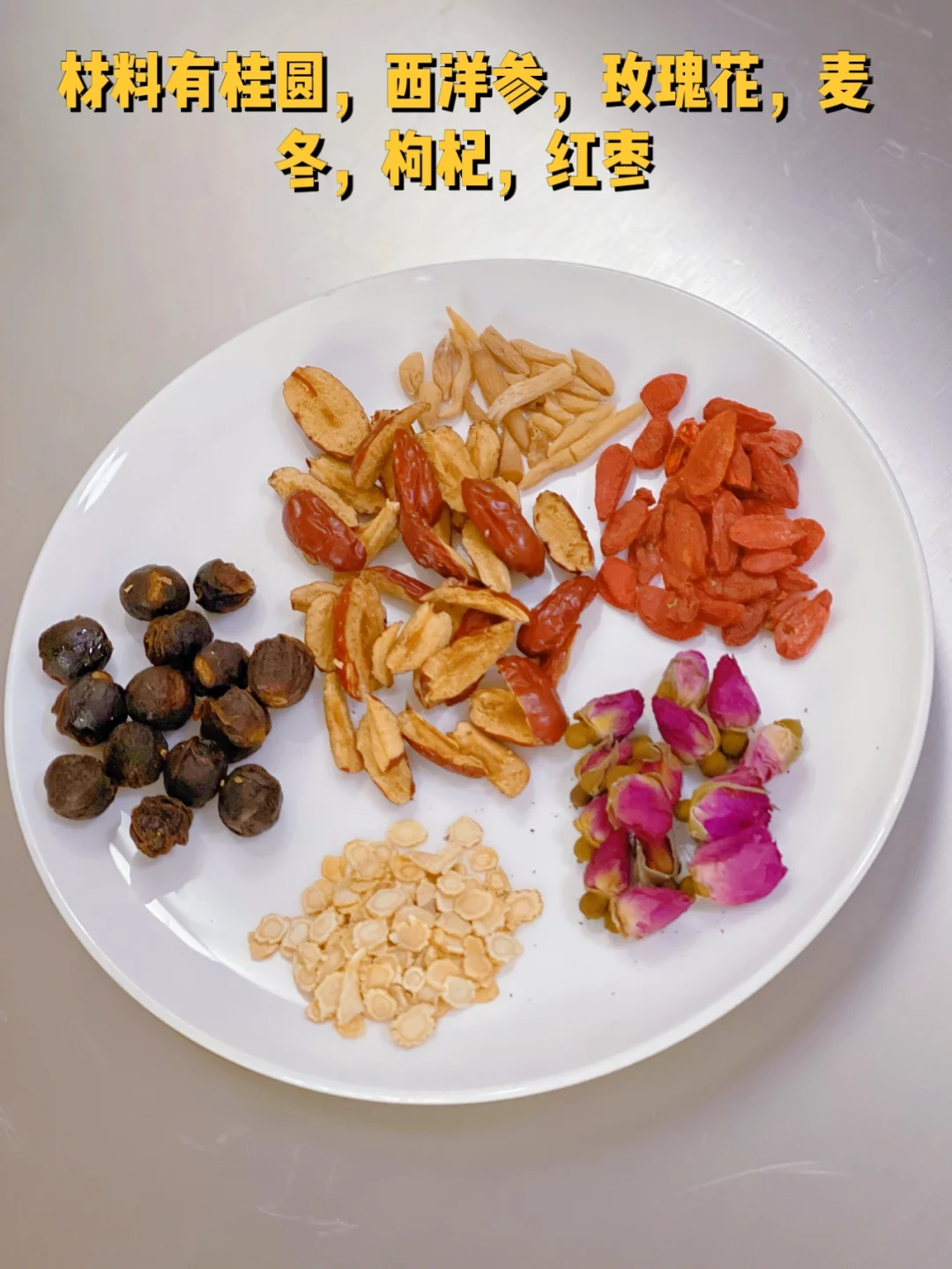 1. 材料有桂圆,西洋参,玫瑰花,麦冬,枸杞,红枣