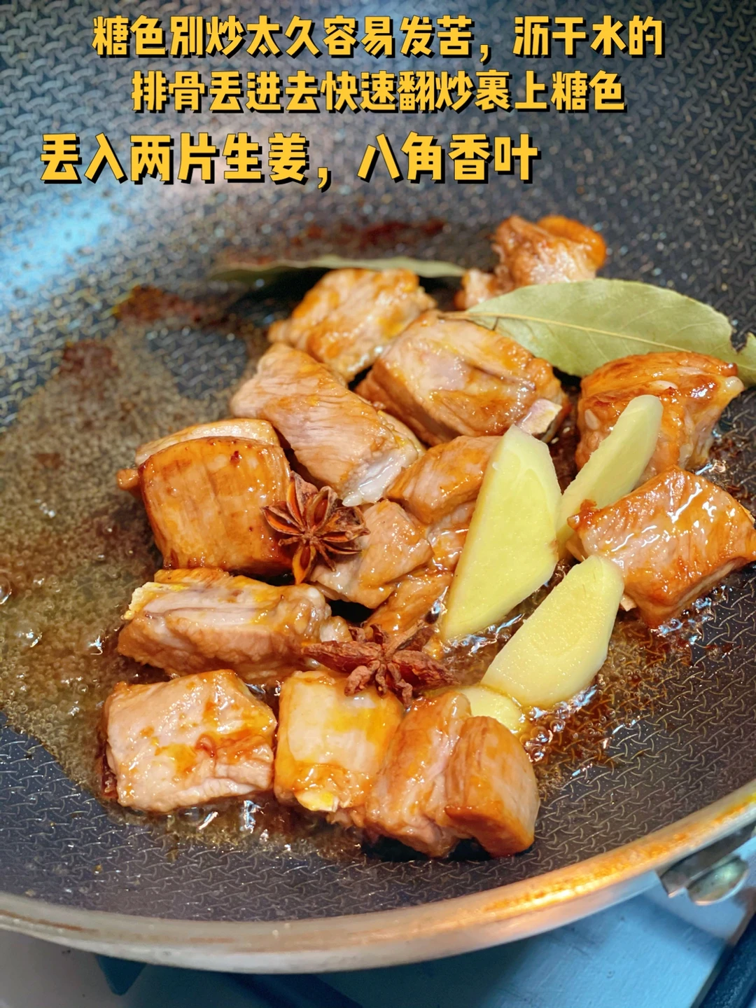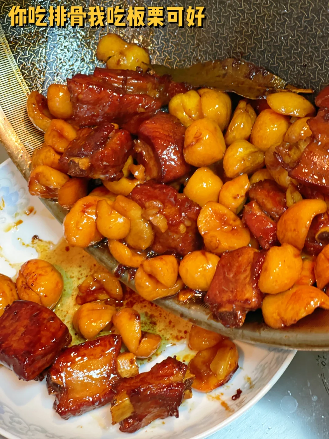 1. 排骨冷水入锅,加入生姜片一大勺料酒煮开温水冲净浮沫 2. 热锅冷油,冰糖丢进去小火慢慢炒糖色,锅铲不停的压压,丢入两片生姜,八角香叶 3. 一勺料酒一勺生抽半勺老抽快速翻炒 4. 加入适量水没过排骨就行,大火煮开后转中火继续慢慢煮 5. 三分之二汤汁儿的时候加入板栗,我喜欢软糯一点的所以早一点放了 6 三分之一汤汁儿的时候加入适量盐,鸡粉然后转大火收汁儿,收汁儿的时候锅铲不停的翻炒哦