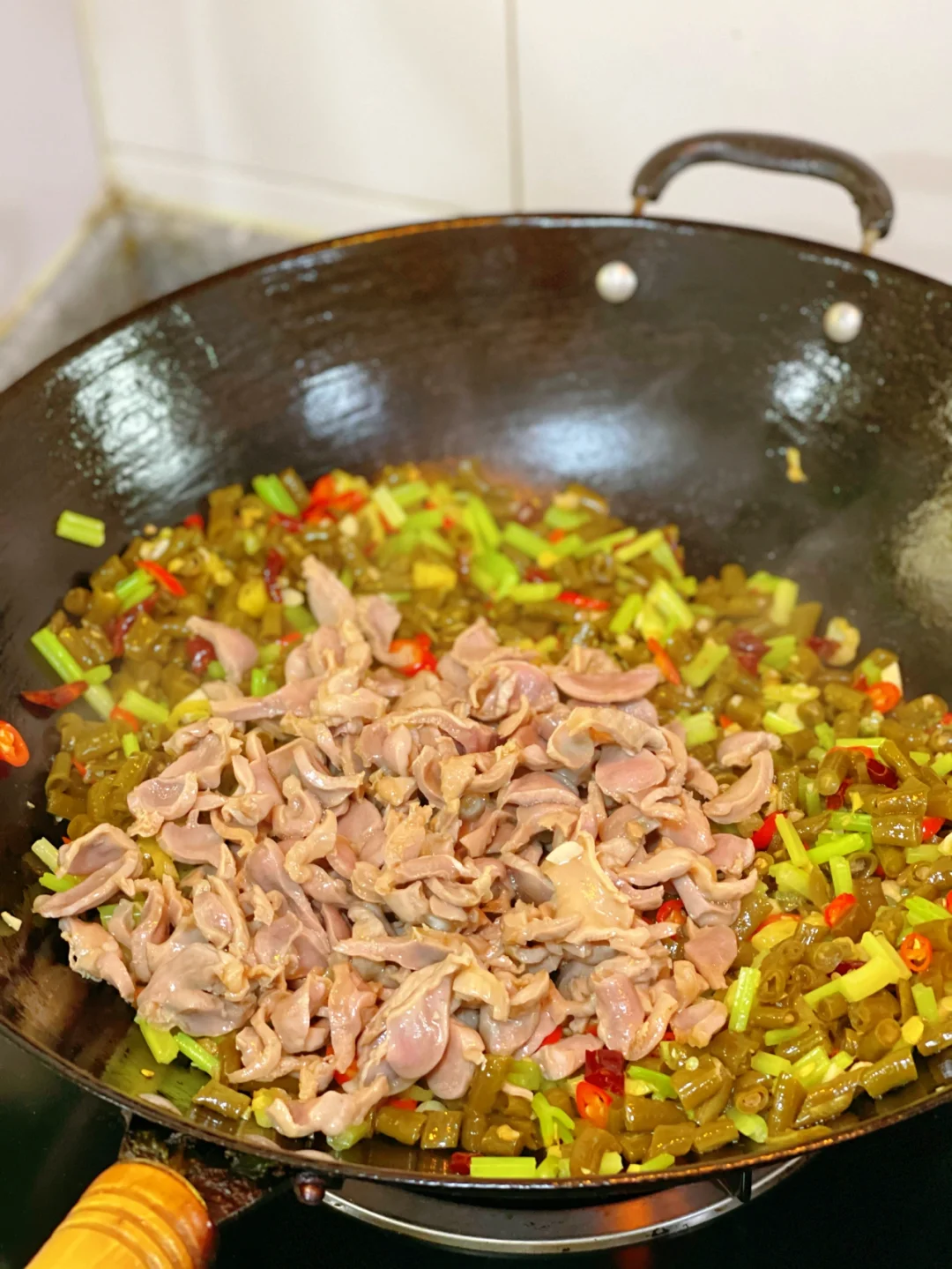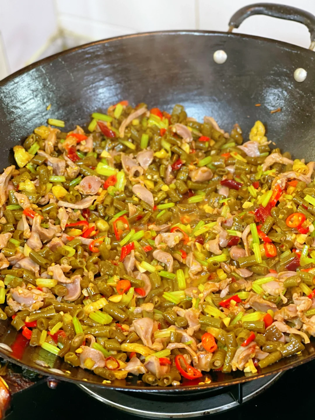 因为家里去年腌制的酸豆角得赶紧吃掉