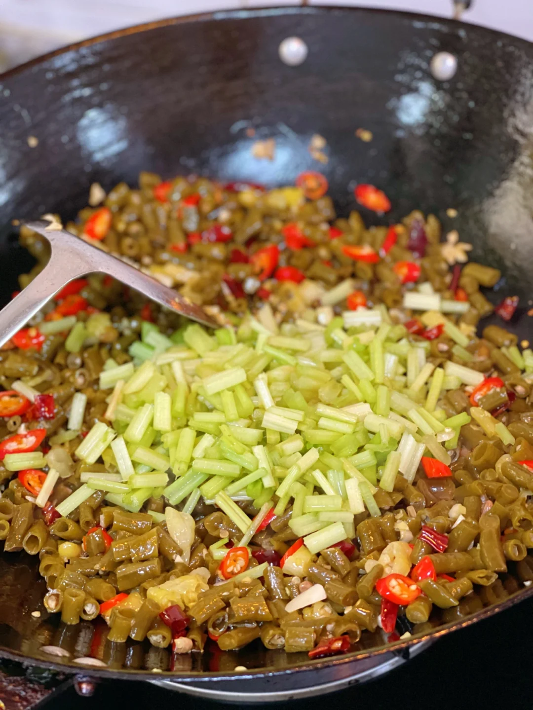 5.酸豆角丢进去炒一会儿之后芹菜段也丢进去