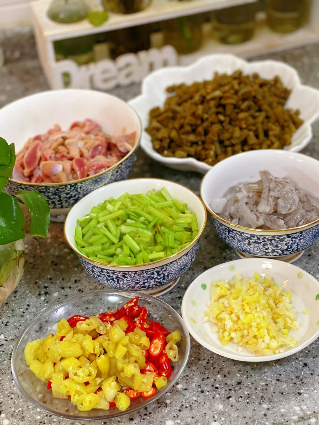 2.大蒜生姜切末,小米辣泡椒切小段,今天家里有芹菜所以放了一点,其实用蒜苔会更香哦