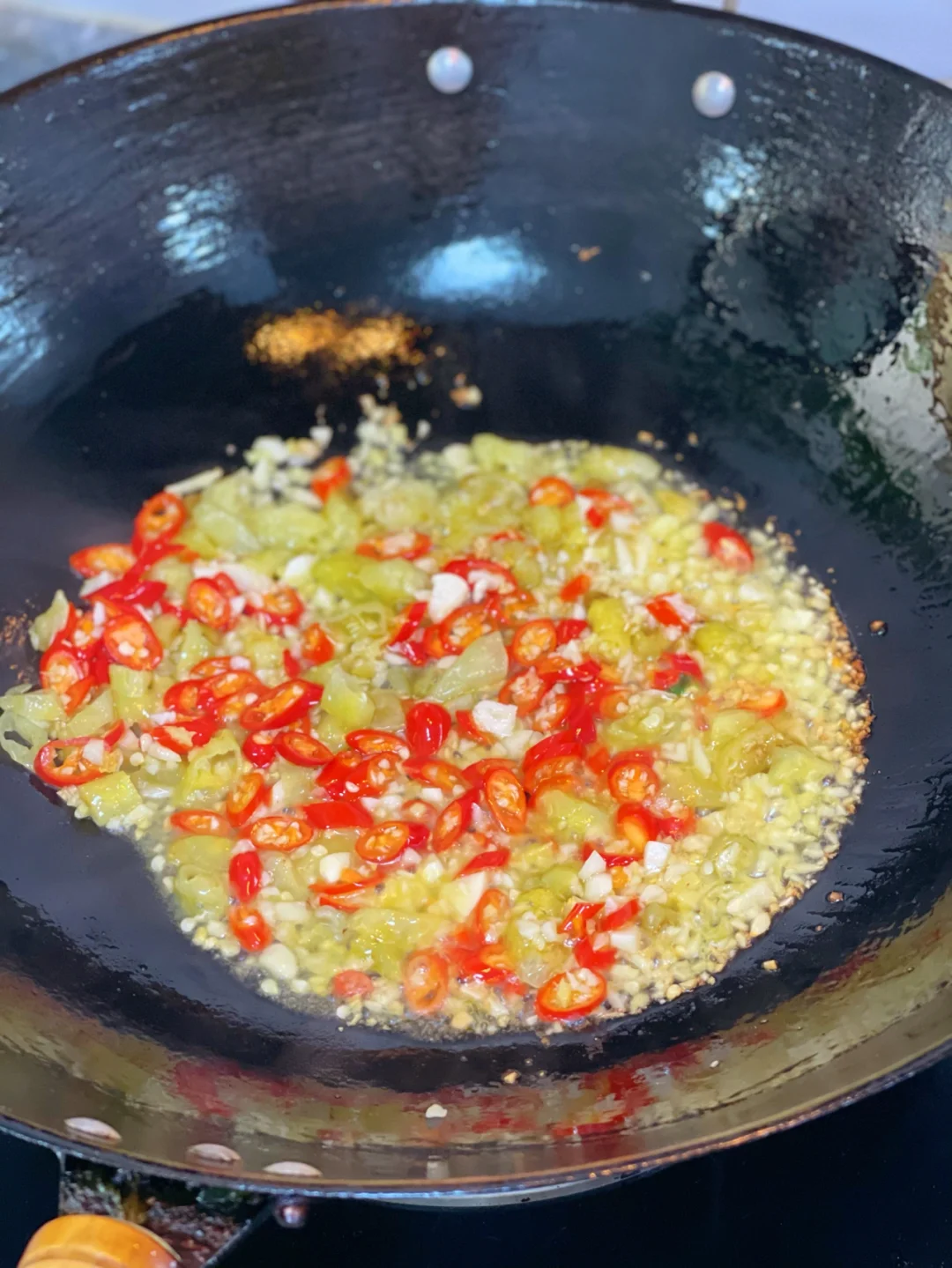 4.重新洗锅上油小火爆香大蒜生姜沫小米辣泡椒段