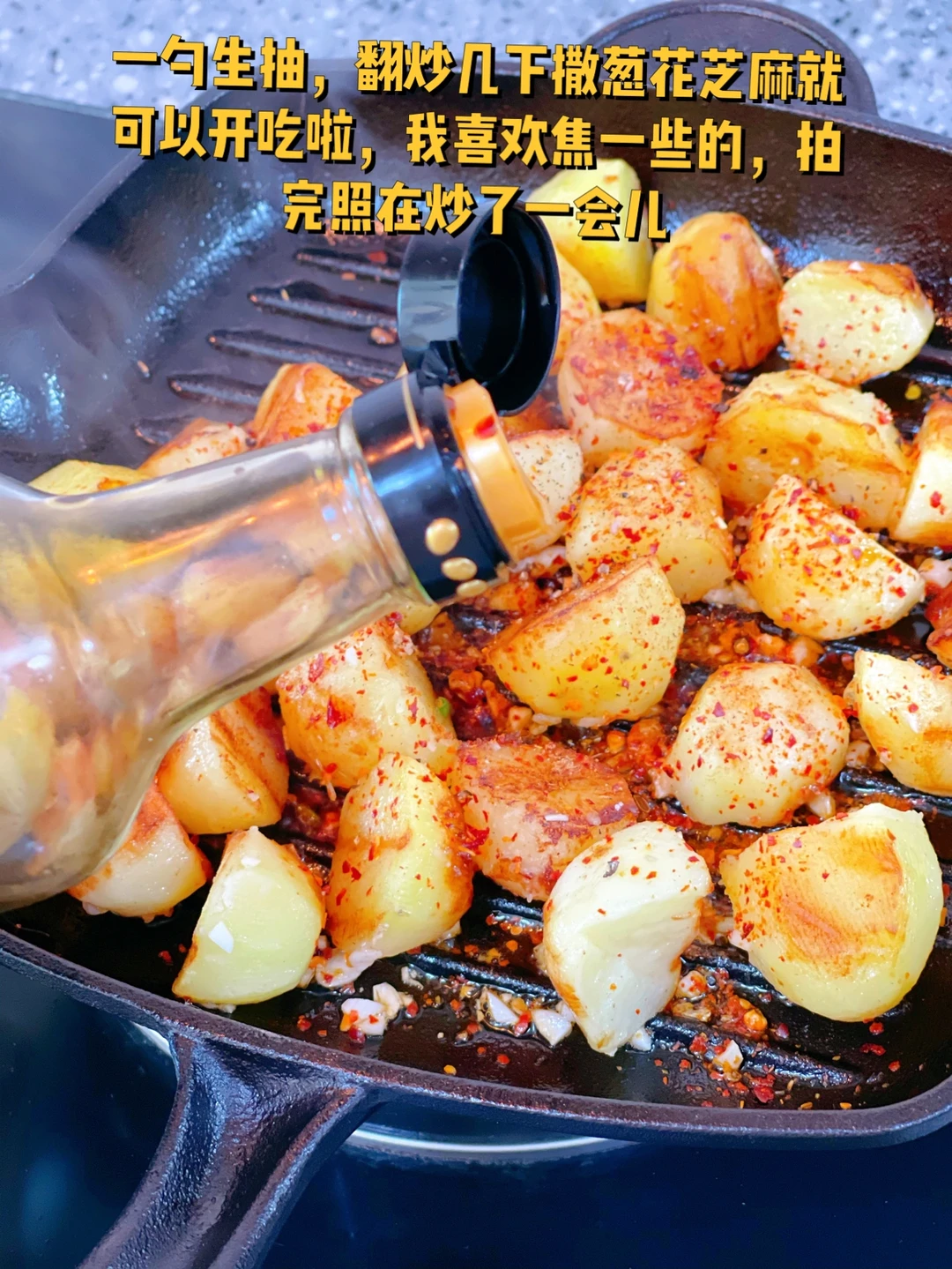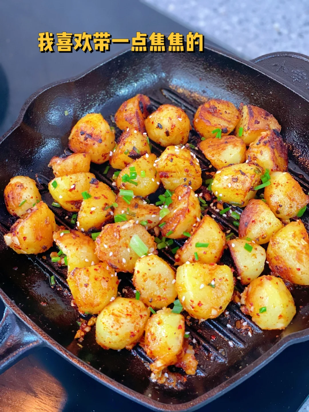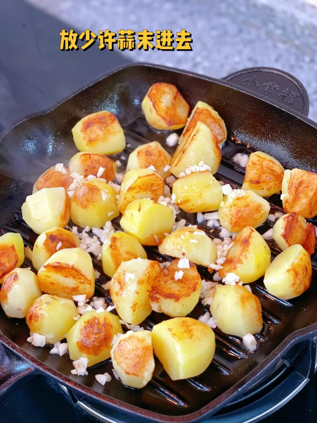 3. 新买的煎牛排的铁锅刚好用上了,大火把锅烧热放少许油,土豆放进去之后马上转小火每面都煎制成金黄色