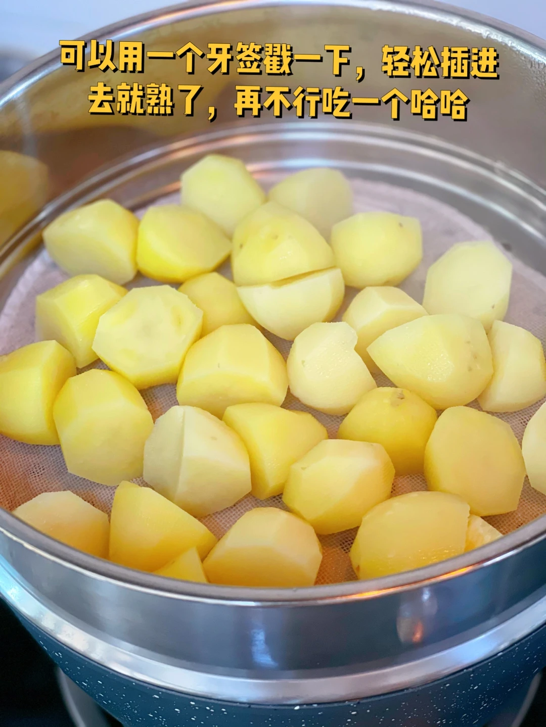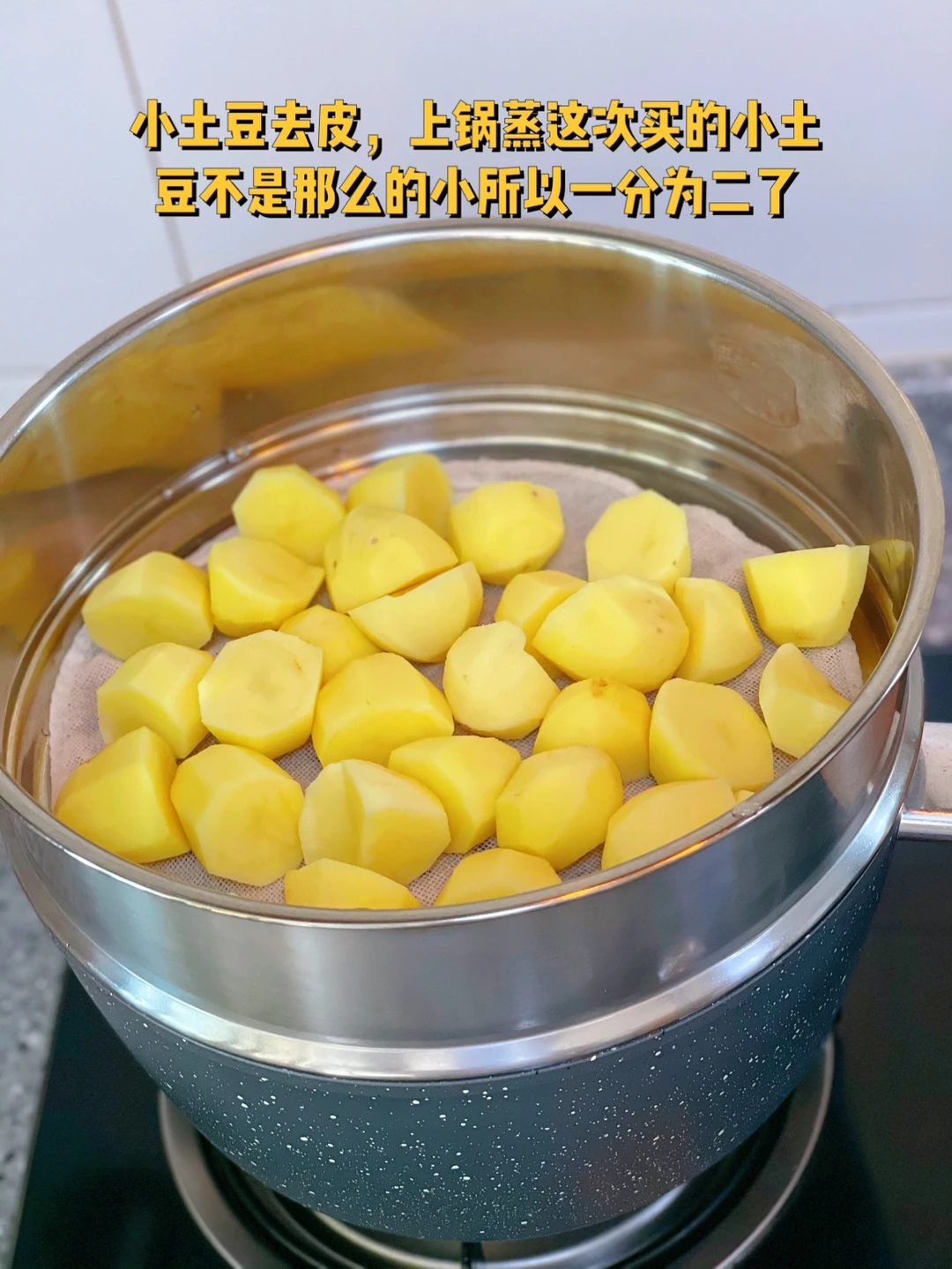 1. 小土豆去皮,上锅蒸这次买的小土豆不是那么的小所以一分为二了