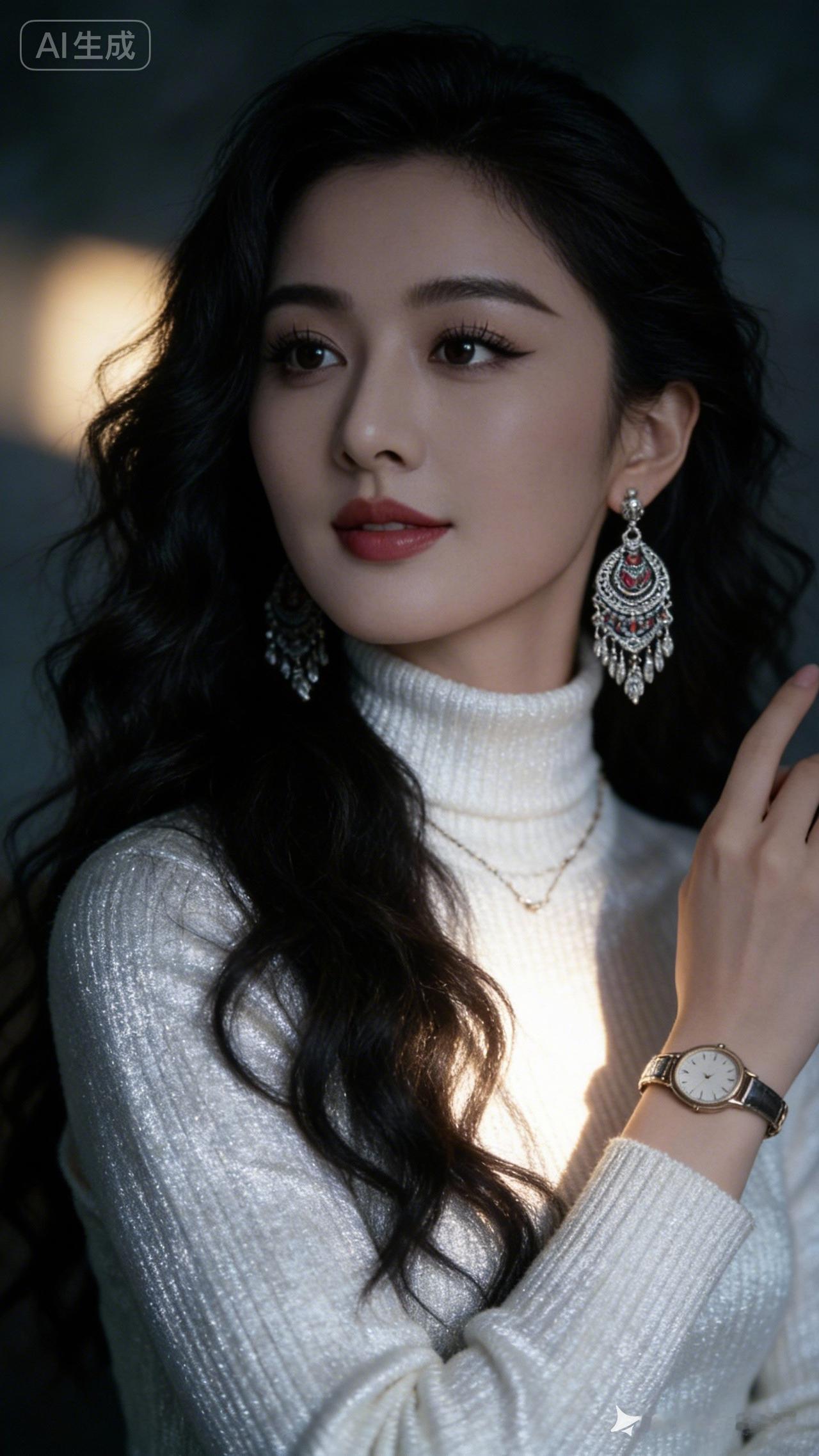 冷艳绝色美人肤白胜雪,五官精致立体,烟熏眼衬长睫魅惑,亮泽红唇噙浅媚笑意。微卷长发披散,银白高领毛衣显贵气疏离,银饰耳环、超高清构图绝美。
