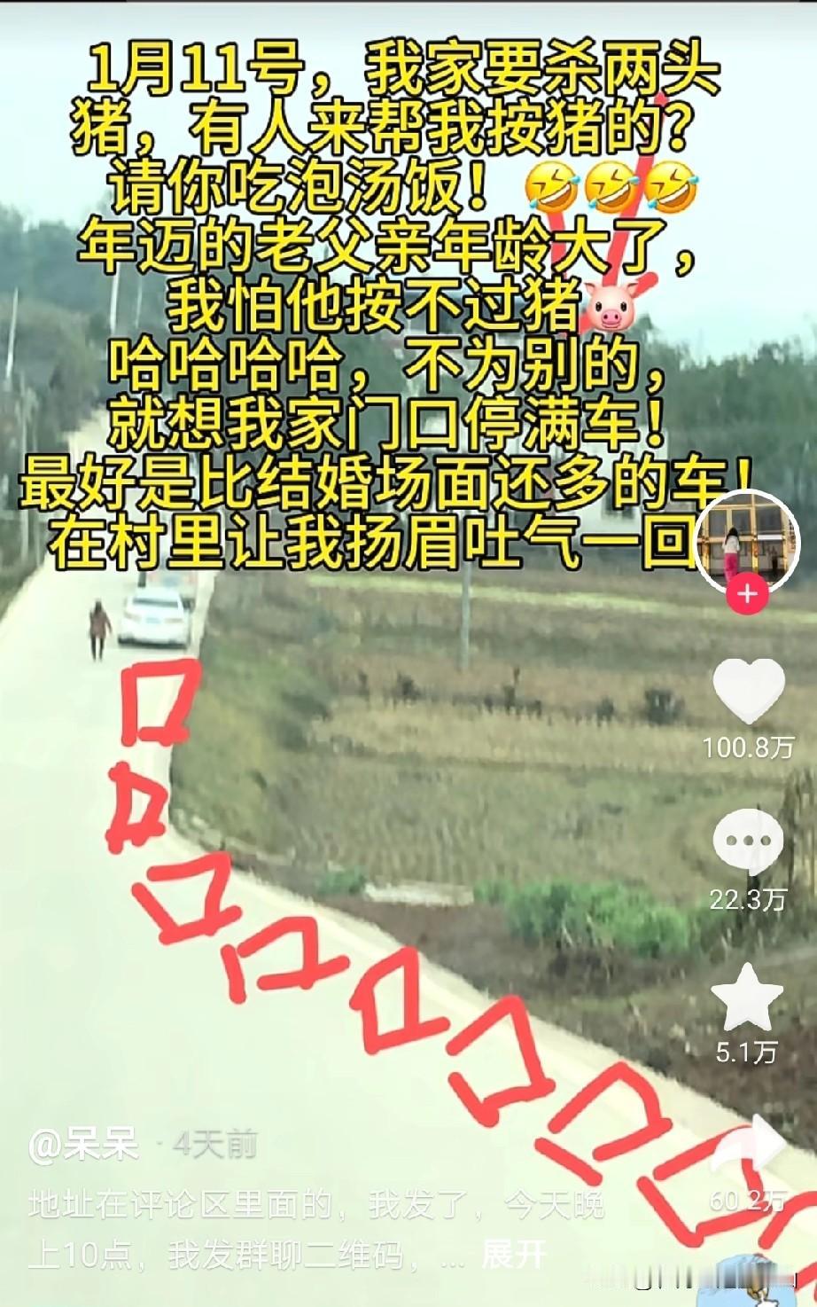 截止1月12日晚上10点,呆呆家的刨猪宴彻底结束了,13日早上,为了不让网友继续奔赴,呆呆家门前的地已经翻了,现在根本站不住脚了。炊事用具也已经被小箱货拉走了,还有村委会的工作人员帮忙善后,拿着喇叭温柔地对网友们说慢走慢走,谢谢啦!呆呆家的大门也关了,处于闭门谢客状态,但是那几个网红还迟迟不肯散去,还在呆呆家门口播着,看着就闹心。 昔日宁静的小村庄,突然因为呆呆家要杀两头猪爆火,一下子来了几千人,村子外面那些公路上车子停满了几公里远,所幸有公安、交警、村委会、文旅局的工作人员各方面调度,不然就凭呆呆,真的只能呆愣着了。 这波流量,呆呆真的大赚一笔,榜一大哥豪刷10万,呆呆收到的礼物,据说加起来可以赚200多万。呆呆做梦都想不到,一条自己家要杀两头猪,需要几个人帮忙按猪,竟然火了,一呼百应,竟然号召了四面八方的网友来吃一碗汤泡饭,自己一下子就从一个月薪几千元的美甲师成为一个百万富翁,关键是呆呆还未婚。 榜一大哥在直播间说,呆呆虽然才23岁,但很能干,她家现在二楼的楼房也是呆呆自己攒钱盖的,她自己还开了一个美甲店,平时客流量也还可以。这女孩真的敢想敢干,怪不得能成功。 有人猜测呆呆家估计在村子里面人缘不好,不然不会杀一个年猪都叫不动亲戚来按猪,我觉得不能这样理解,估计呆呆是独生女,家里除了老父亲没有男丁,村里面讲究互相帮助,呆呆又长期在外面上班,每年都是叫别人来帮忙,自己又帮不了别人,久而久之肯定不好意思。 加上这次呆呆不但需要人按猪,还需要家门口的路上停满多多的车,要让自己在村子里面扬眉吐气一回,也许刚好就是最后这几句话,让网友们愿意奔赴而来,加上很多人长时间在城里生活,很多年已经没有感受到农村杀猪饭的味道了,他们愿意为童年的回忆和味道奔赴一次。 两天时间,呆呆收礼物收到手软,各种嘉年华火箭让她眼花缭乱,她拿着话筒,站在自己家阳台上,大声对着直播间和来吃饭的网友们说:“已经不能再给了,再给的话我都要有心理负担了。她还说杀猪饭就到今晚10点结束,希望大家回家注意安全。” 其实呆呆已经多招待一天了,她说自己连续两天没有睡觉了,1月11日杀猪,1月10日晚上看到自己随手建的500人的猪友群已经爆满,就感觉她是在应付不了了,当天晚上她就失眠了。 紧接着,第二天一起来,看到人流量不断增多,她一直对自己说自己这次闯祸了,她说自己不担心自己家的两头猪被吃完,就担心人太多猪肉少招待不好,所幸合川文旅赞助两头猪,直播间有一个大哥又赞助了1头,总共杀了5头猪总算把事情应付下去了。 现在,呆呆决定好好休息一下 这波流量由合川文旅接手,合川文旅也响应网友号召,在距离呆呆家不远的地方办了合川友军泡猪汤,猪还要继续杀,每天摆100桌,持续到正月十五,游客要提前预约,只是本次不再免费,来的人以50元一人的价格收费,还给游客提供景区门票,利用呆呆的流量搞吃喝玩乐一条龙服务,只能说合川文旅太赞了。