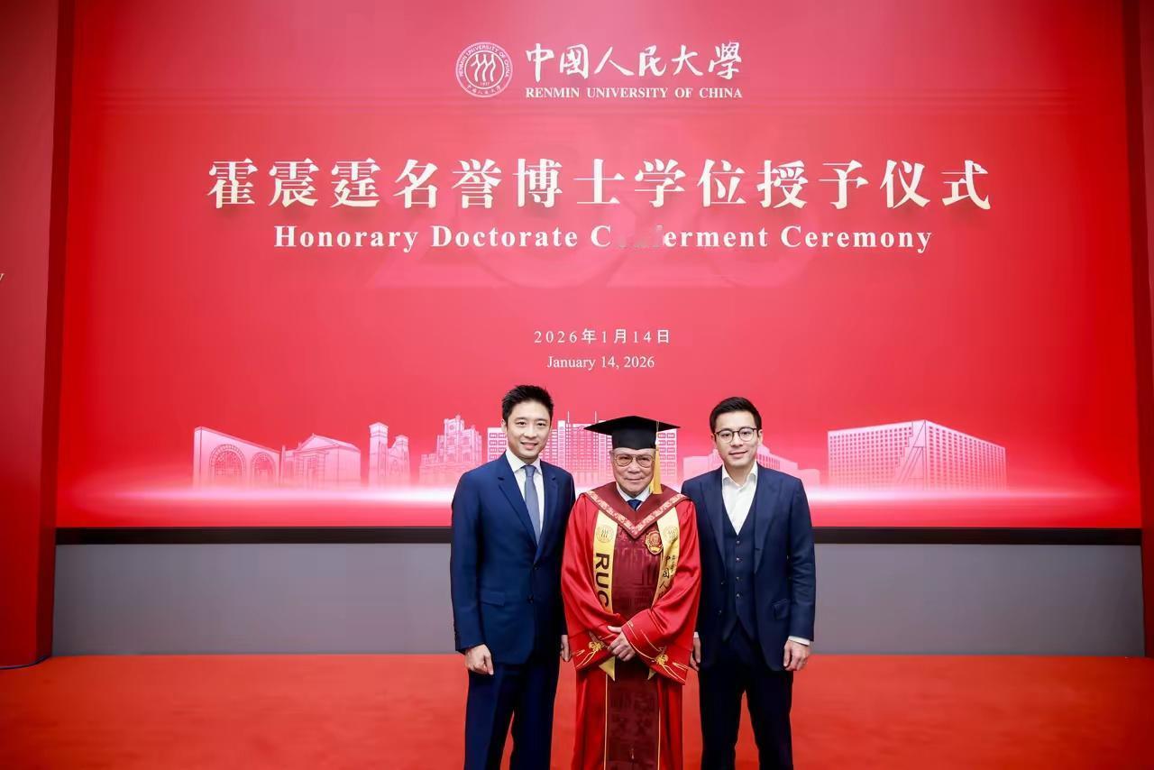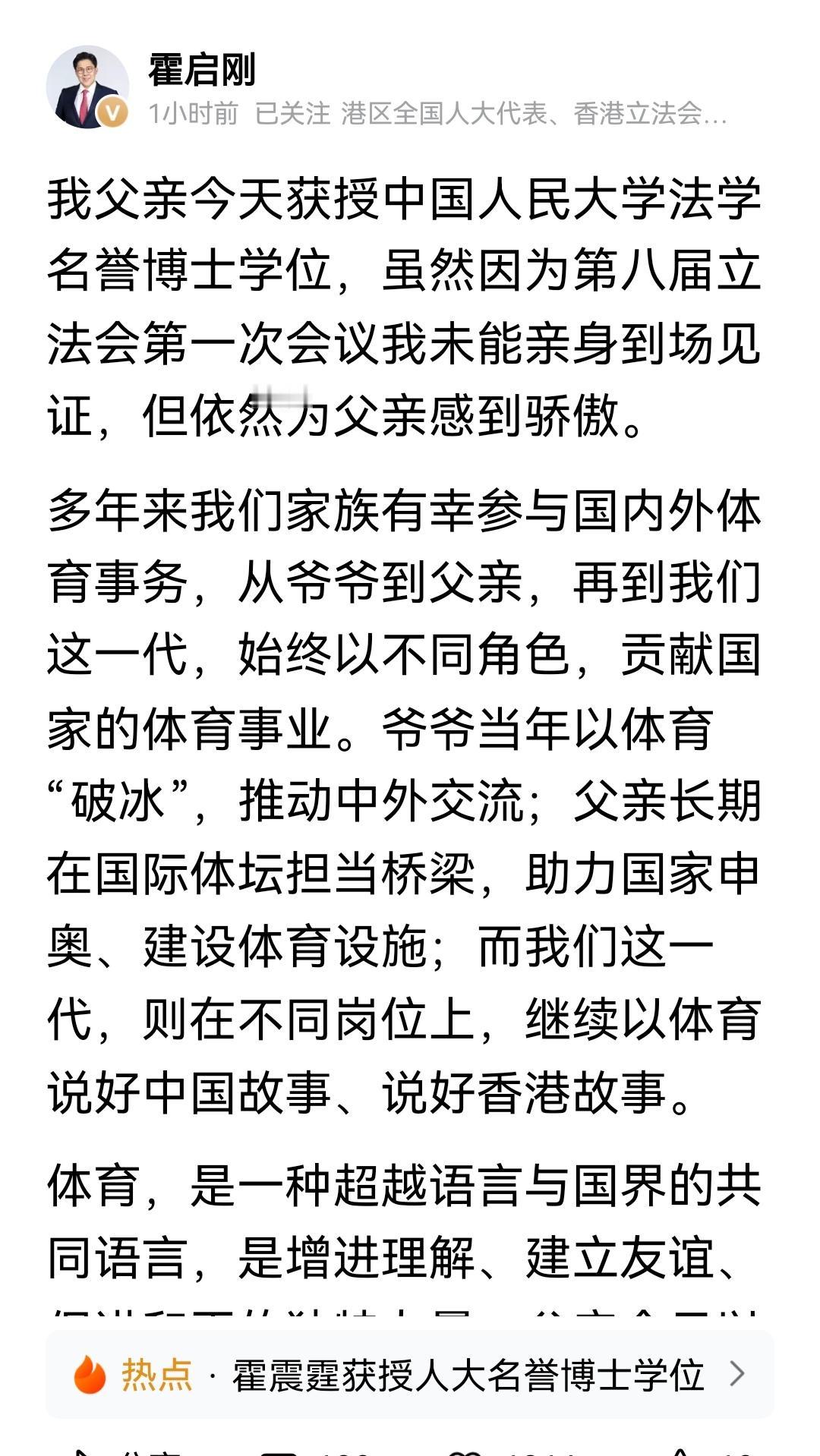 霍启刚的父亲霍震霆先生获得中国人民大学授予名誉博士学位。 中国香港霍家从霍启刚的爷爷霍英东先生开始就始终关心关注国内体育事业的发展,“助力国家申奥,建设体育设施”虽然,霍启刚说因为第八届立法会议,未能亲自到场见证,但是依然为父亲感到骄傲! 霍震霆先生的父亲霍英东先生解放前曾经资助过国内走过危难时期。 霍启刚未能亲自见证父亲的幸福时光,但是霍启刚的弟弟霍启山出席见证了了他们的父亲的荣光时刻。