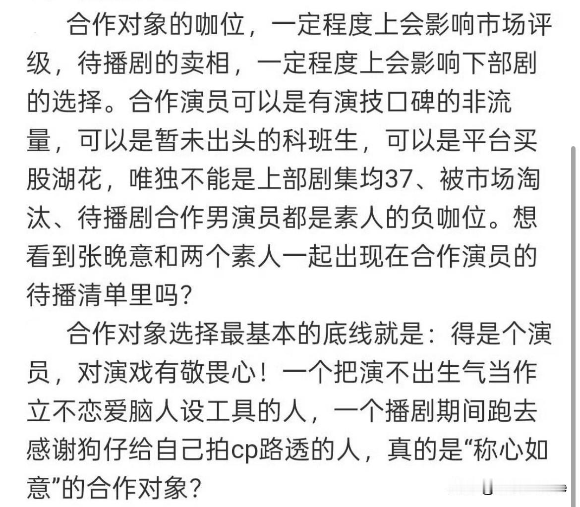 1月15日,张晚意粉丝婉拒沈月出演《但愿人长久》女主,直言沈月身材,长相,适配度,咖位,口碑,热度,演技,台词一样不行! 句句没提沈月,句句都是沈月,有一说一,沈月这些年资源不错,大大小小的剧都拍了不少,但大部分人只记得一部剧《流星花园》,后面拍的剧很少有出圈的,她不扛剧是真的,热度低也是真的,她跟张晚意适配度不高,确实如此,想帮沈月说几句的,结果看完张晚意粉丝的合作对象…… 我觉得沈月还是有她的可取之处的,不然也不会这么多年不温不火,还能一直拿到女主剧,资源还能这么好 张晚意