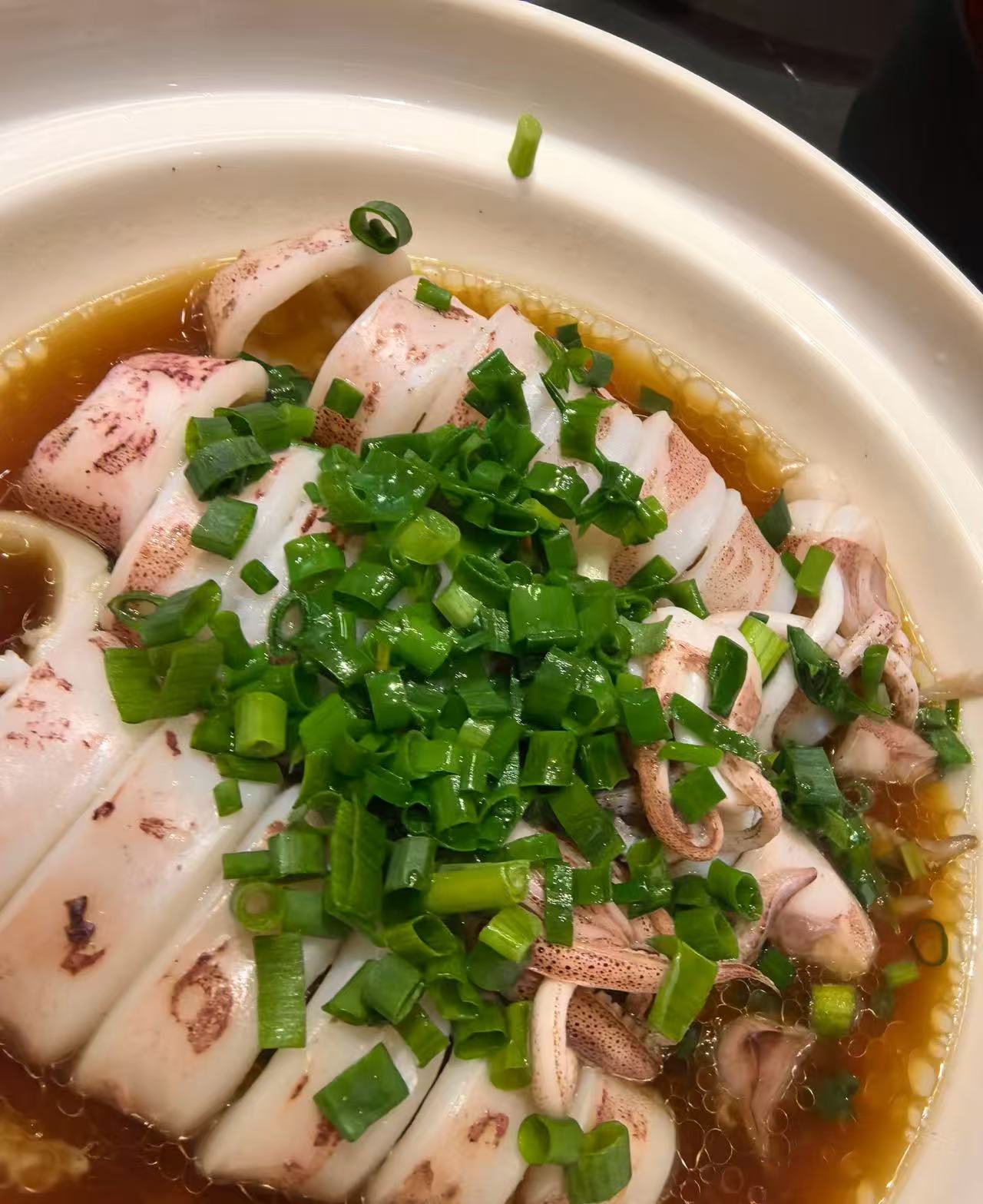 2️⃣.葱香鱿鱼,白灼做法,浇上葱花和鱼豉油,吃起来Q弹美味有嚼劲。