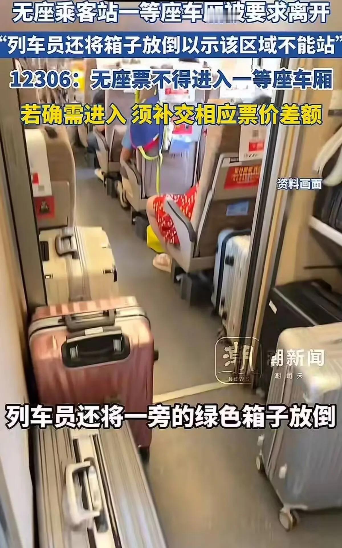 谁懂啊!买二等无座票被挤到窒息,去一等座过道站会儿竟被列车员用箱子拦路驱赶!