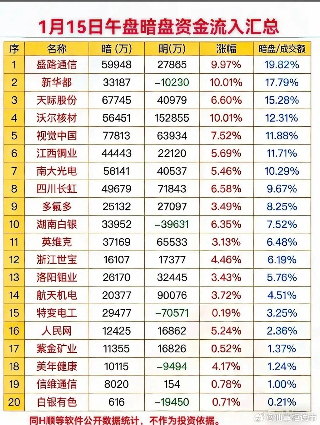 1月15日午盘暗盘资金流入汇总,带你揭秘市场动向!午盘暗盘资金流向活跃,盛路通信、新华都等个股涨幅显著,资金流入明显,市场交投情绪午盘暗盘资金活跃,盛路通信、新华都等个股涨幅显著,资金流入明显,市场热度攀升