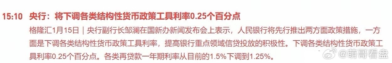 A股收盘后迎来重大利好!明天A股有望大幅修复吗?刚刚在国新办会上,央行相关负责人直接表示下调各类结构性货币政策工具利率0.25个百分点。各类再贷款一年期利率从目前的1.5%下调到1.25%。大家看这个消息,是不是重大利好?下调各类结构性货币政策工具利率0.25个百分点,这不就是相当于降息吗?这个消息出来后,港股有一定的拉升。下调各类结构性货币政策工具利率0.25个百分点,无疑是有望提高机构放款的积极性,有望引导更多的资金投放市场。所以明天A股有望长虹作为本周的结尾。大家觉得呢?