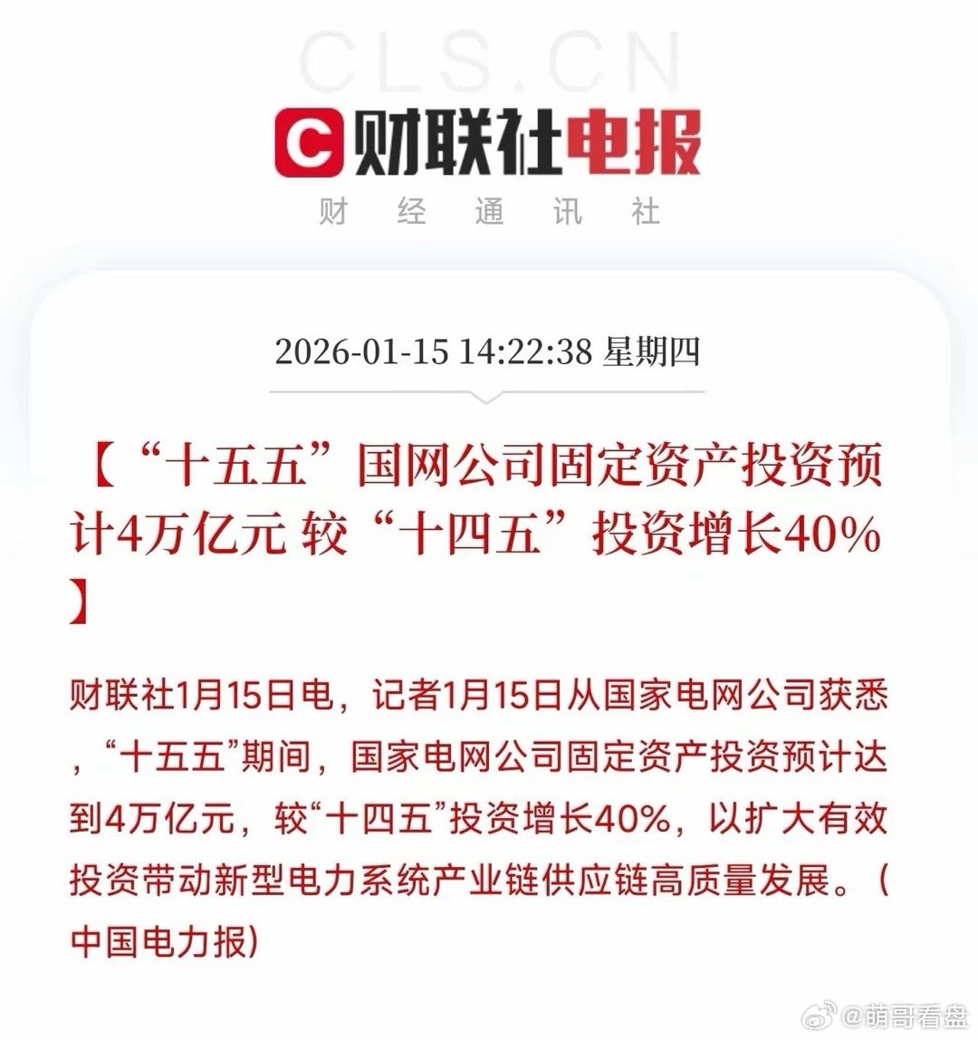 利好,大利好,又是大利好!“十五五”国网公司固定资产投资预计4万亿元较“十四五”投资增长40%。相当于每年投资8000亿,这是大利好,对于电网设备,基建,特高压,电力都是大利好。人工智能和算力的尽头就是电力,未来发展各行各业都将离不开电力,电力空缺巨大,机会也是巨大的,投资空间巨大,预期拉满。恭喜持相关概念板块的朋友们,明天又有大肉吃了!财联社1月15日电,记者1月15日从国家电网公司获悉,“十五五”期间,国家电网公司固定资产投资预计达到4万亿元,较“十四五”投资增长40%,以扩大有效投资带动新型电力系统产业链供应链高质量发展。4万亿投资驱动下,电网向绿色、智能、强韧升级,新能源并网、特高压、配网数智化与全产业链迎来黄金发展期。一、投资预期①投资规模:固定资产投资达4万亿元,创历史新高,带动产业链供应链高质量发展 。②能源转型:风光新能源装机年均新增约2亿千瓦;非化石能源消费占比25%、电能占终端用能比重35%;满足3500万台充电设施接入 。③电网能力:建成主配微协同新型电网平台;跨区跨省输电能力较“十四五”末增长超30%;强化“西电东送、北电南供”,支撑“沙戈荒”与西南水电外送 。④科技与产业:攻克关键核心技术,推动产业链供应链全面自主可控;建成能源电力原创技术策源地,形成领先产业集群 。二、发展空间1.新能源并网:年均2亿千瓦风光新增装机,配储与调节能力建设空间大,支撑高比例消纳 。2.特高压与主网:外送通道提速,特高压投资与技术迭代(如柔性直流)空间广,跨区优化配置能力显著提升 。3.配网与微网:城市、农村、边远地区配网升级,探索末端保供/离网型微网,提升供电可靠性与灵活性 。4.数智化转型:AI、大数据、数字孪生等深度应用,“人工智能+”专项推动电网运维与管理效能跃升 。5.产业链带动:投资拉动设备制造(特高压、储能、充电桩)、信息技术、电工装备等上下游,催生新质生产力与产业集群 。总之,4万亿投资驱动下,电网向绿色、智能、强韧升级,新能源并网、特高压、配网数智化与全产业链迎来黄金发展期。且未来发展各行各业都将离不开电力,电力空缺巨大,机会也是巨大的。