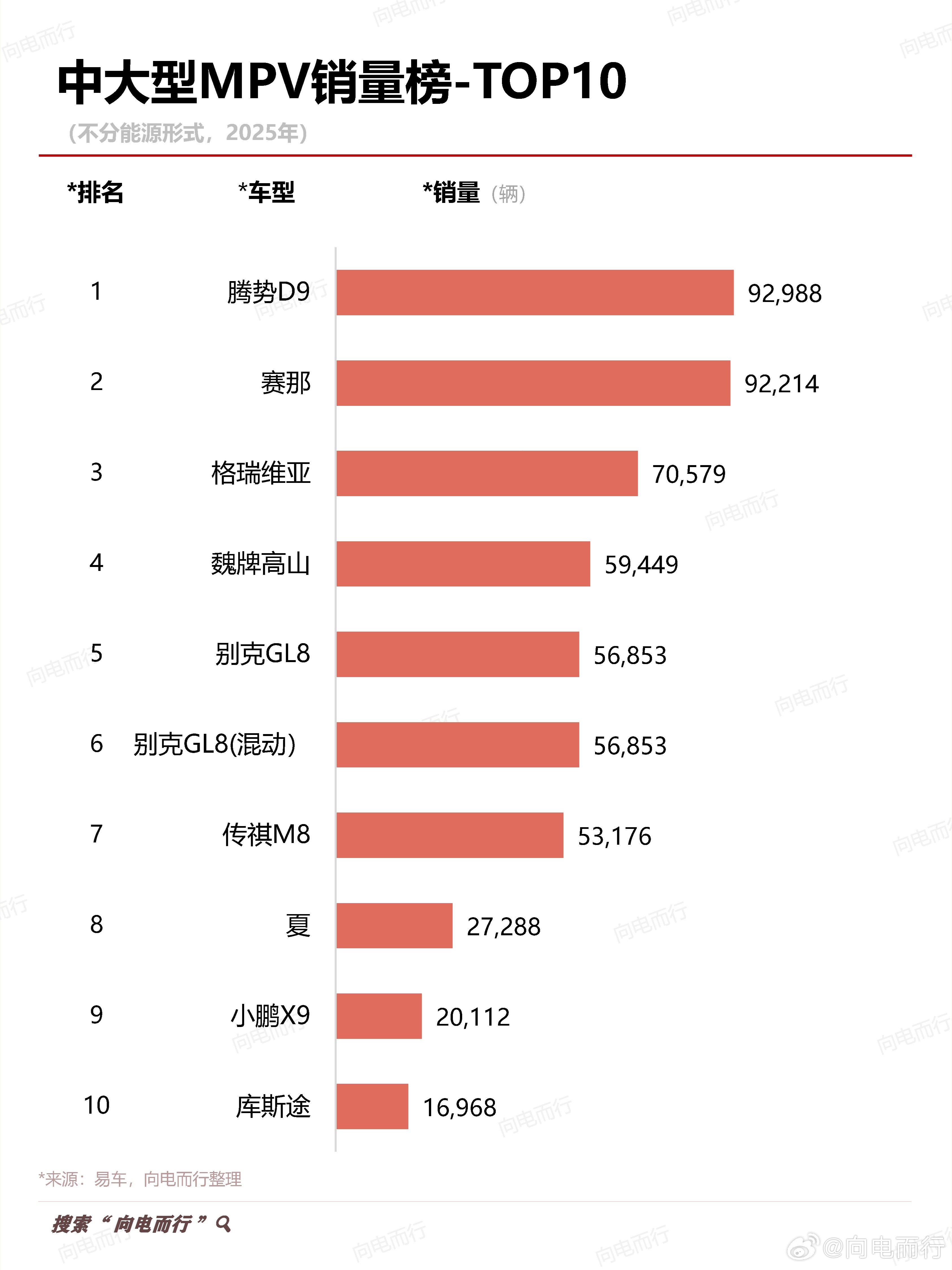 中大型MPV销量榜,腾势和赛那差距600台左右,分别拿下第一和第二,26年自主品牌能上榜8名不