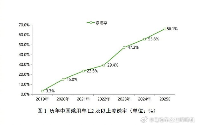 2019年,搭载L2级辅助驾驶的车只有3.3%,2025年,这个数额已经暴涨到6