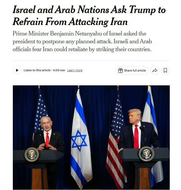 纽约时报消息人士称,以色列总理内塔尼亚胡周三呼吁特朗普推迟任何攻击伊朗的计划。 据报道,卡塔尔、沙特阿拉伯、阿曼和埃及也提出了类似请求。 《纽约时报》写道,以色列和阿拉伯官员担心,伊朗可能会对他们的国家发动报复性打击。