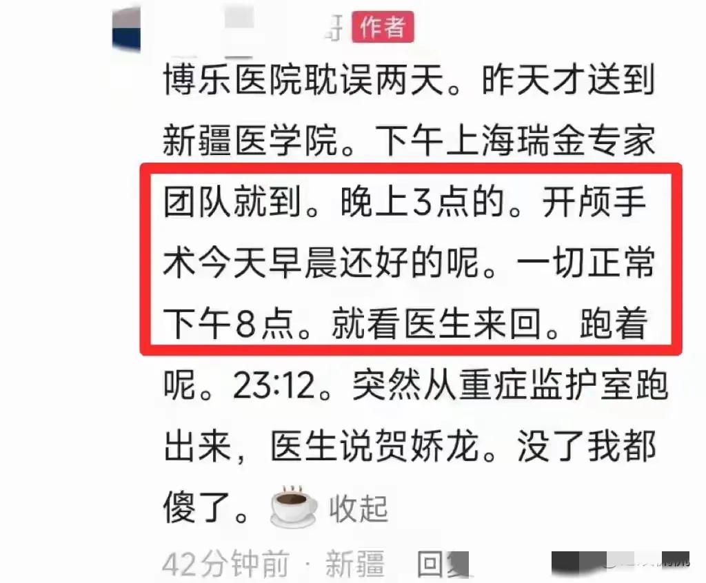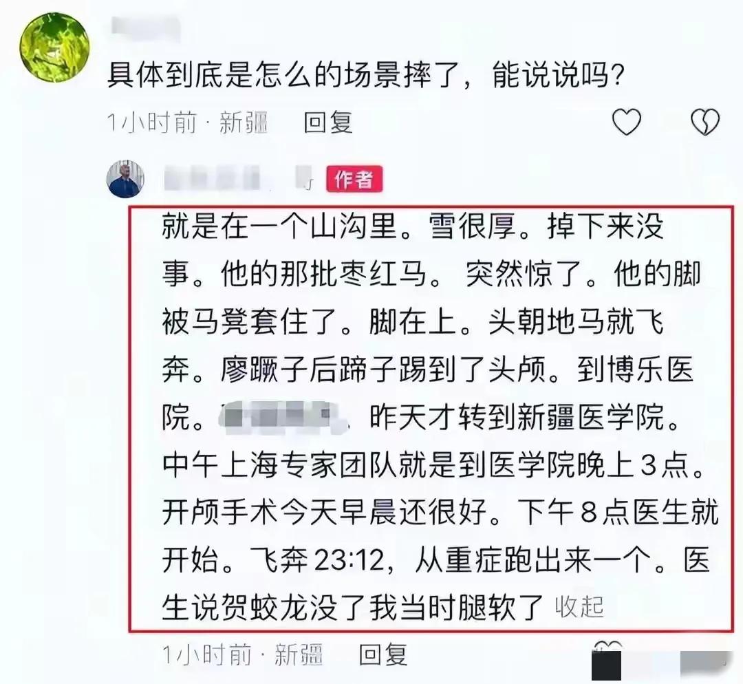 泪目了!贺娇龙出事前几分钟,还在和同事布置工作。下午3点她从马背上摔下来,本来还没什么大问题,但是马受惊了后蹄子踢到了她的头颅。到博乐医院后来转到新疆医学院,上海团队。瑞金医院的专家也赶到了做了开颅手术。1月14日23时12分离世。