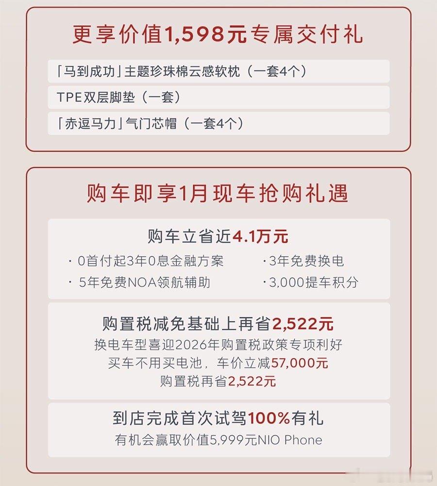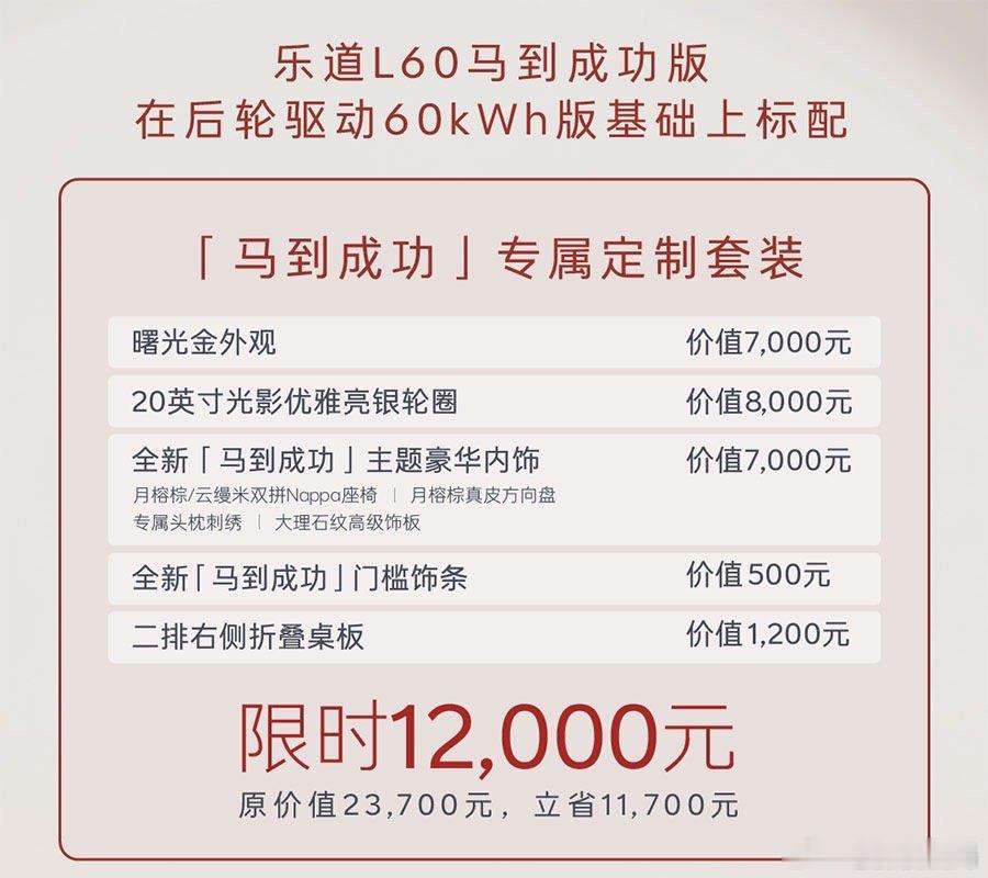 前两天闺女写作文,问我跟马有关的成语都有哪些,我想了想,发现跟马有关的东西好像寓意都挺不错的,比如马到成功,一马当先,戎马一生等等吧,还有这个龙也是,人中龙凤,卧虎藏龙这些,所以龙年和马年对于咱们中国人来说,意义还是比较积极的。所以2026年,各路品牌也都是想办法跟马做关联,比如有人说今年马伊琍的代言就会比往年更多,伊利就应该找马伊琍代言。乐道今天整了一个马到成功版,给了各种马元素的标志,我比较喜欢的是这个气门芯儿帽,也是马的图案,就跟小米那个OK手势的气门芯儿帽一个意思,比较好玩。包括车机的页面也是马的主题,同步配套上了。车里面还有双拼色的Nappa座椅,价格这块大家可以看一下图片,如果要是租电的话是16.19万,然后电池部分还不用交购置税,能便宜个2522块钱。这种带点特别版的车,以后就算是卖二手估计也能稍微多卖个几千块钱吧?毕竟像“马到成功”这样的好彩头,中国人还是愿意讨的。蔚来文/王琳